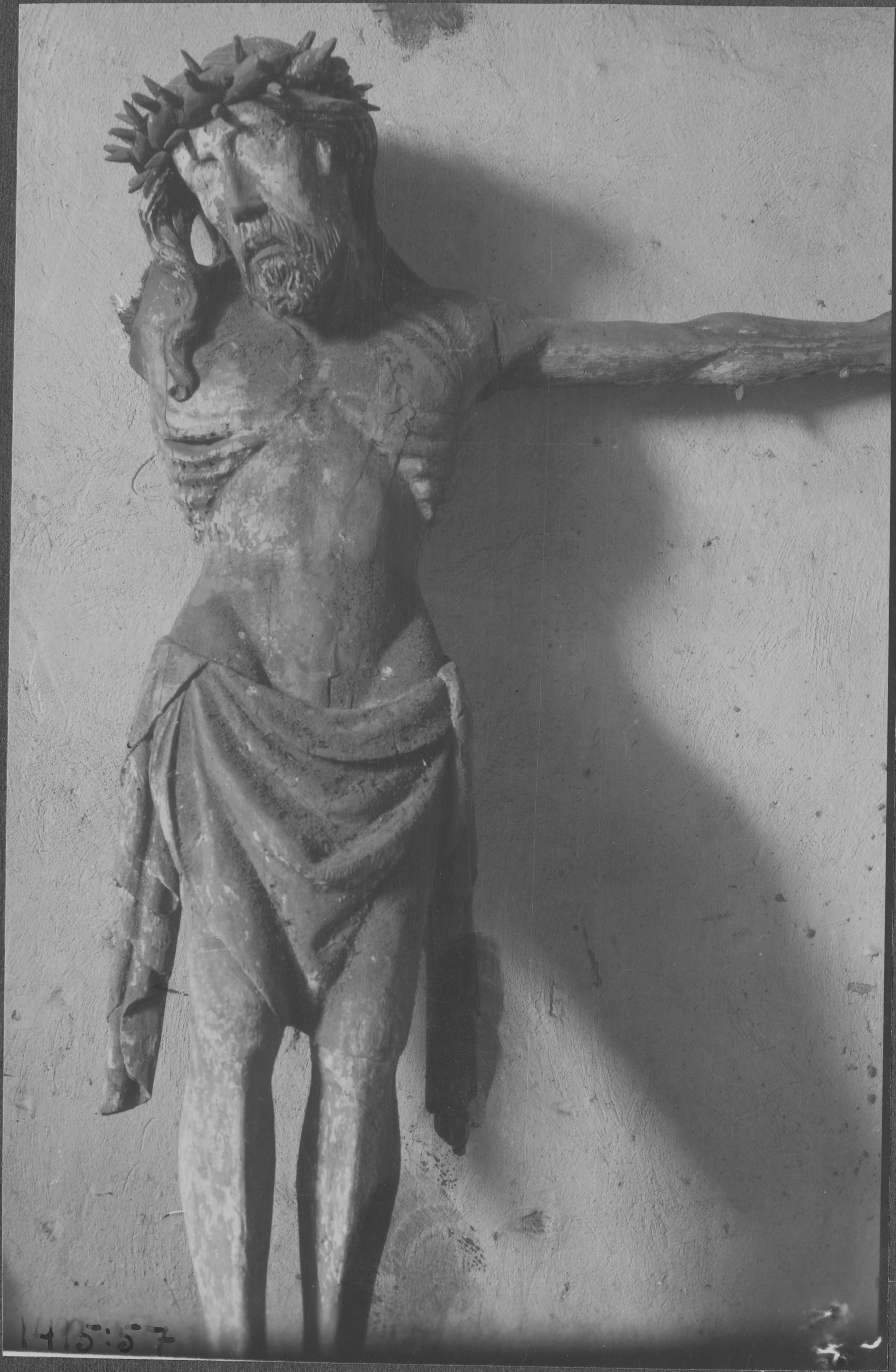 Beskrivning: Triumfkrucifix av trä. Ena armen löst bevarad. 1300-talets slut. Snabbinventering.