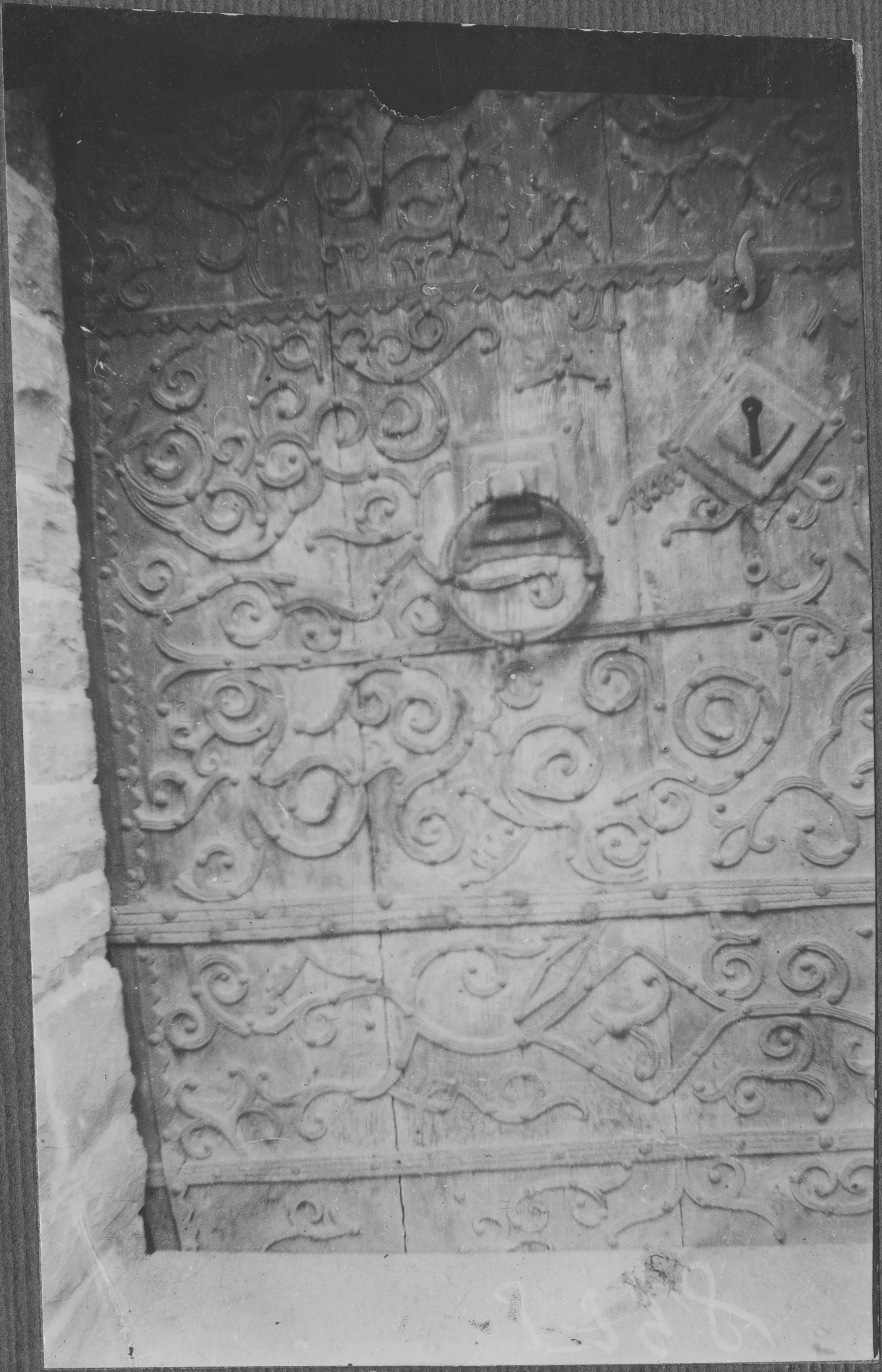 Beskrivning: Port, medeltida, rikt försedd med järnsmide i slingrande mönster och har troligen någon typ av ytbehandling.