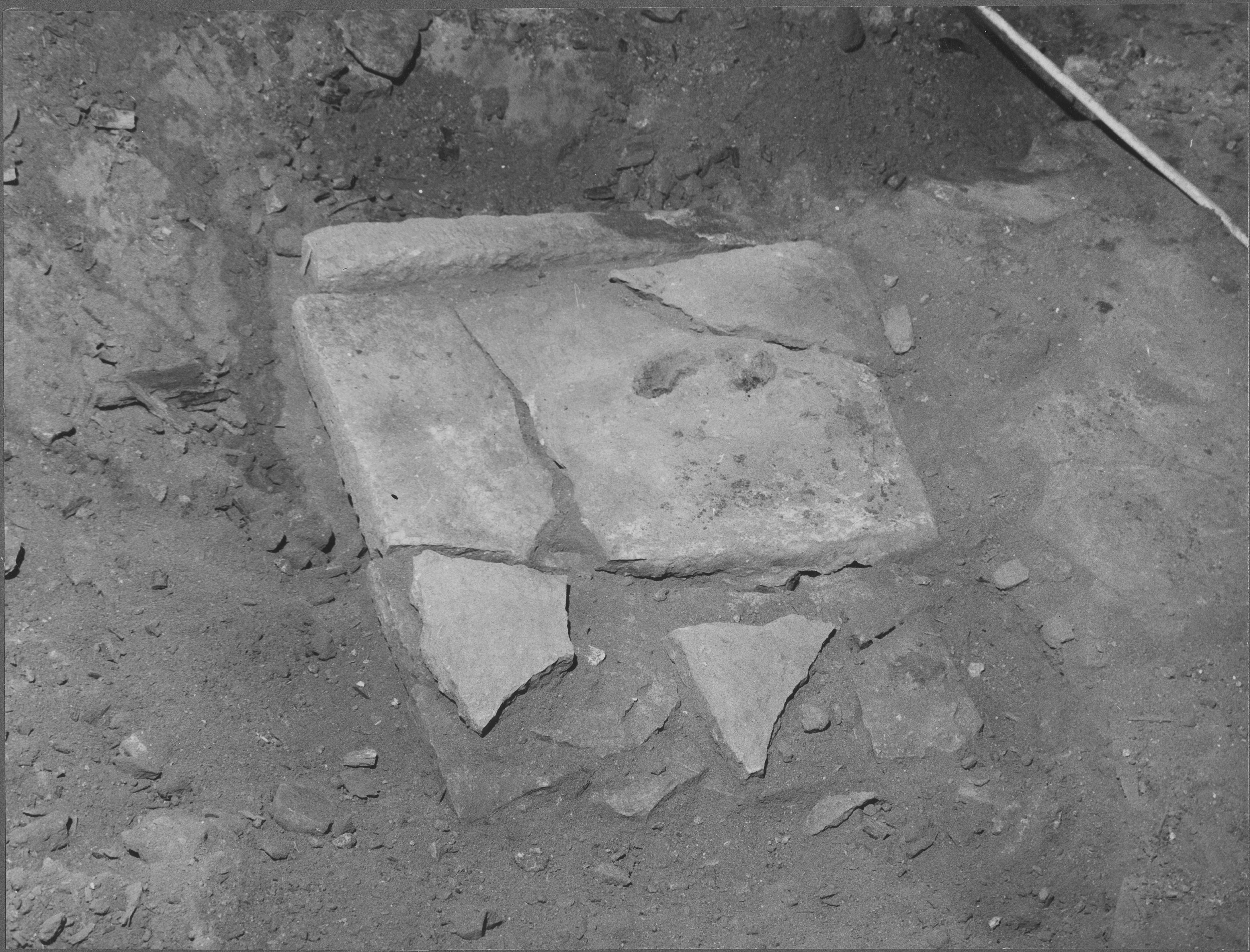 Beskrivning: Medeltida hällkistas huvud-hälft under södra tvärbyggnadens västra mur.
