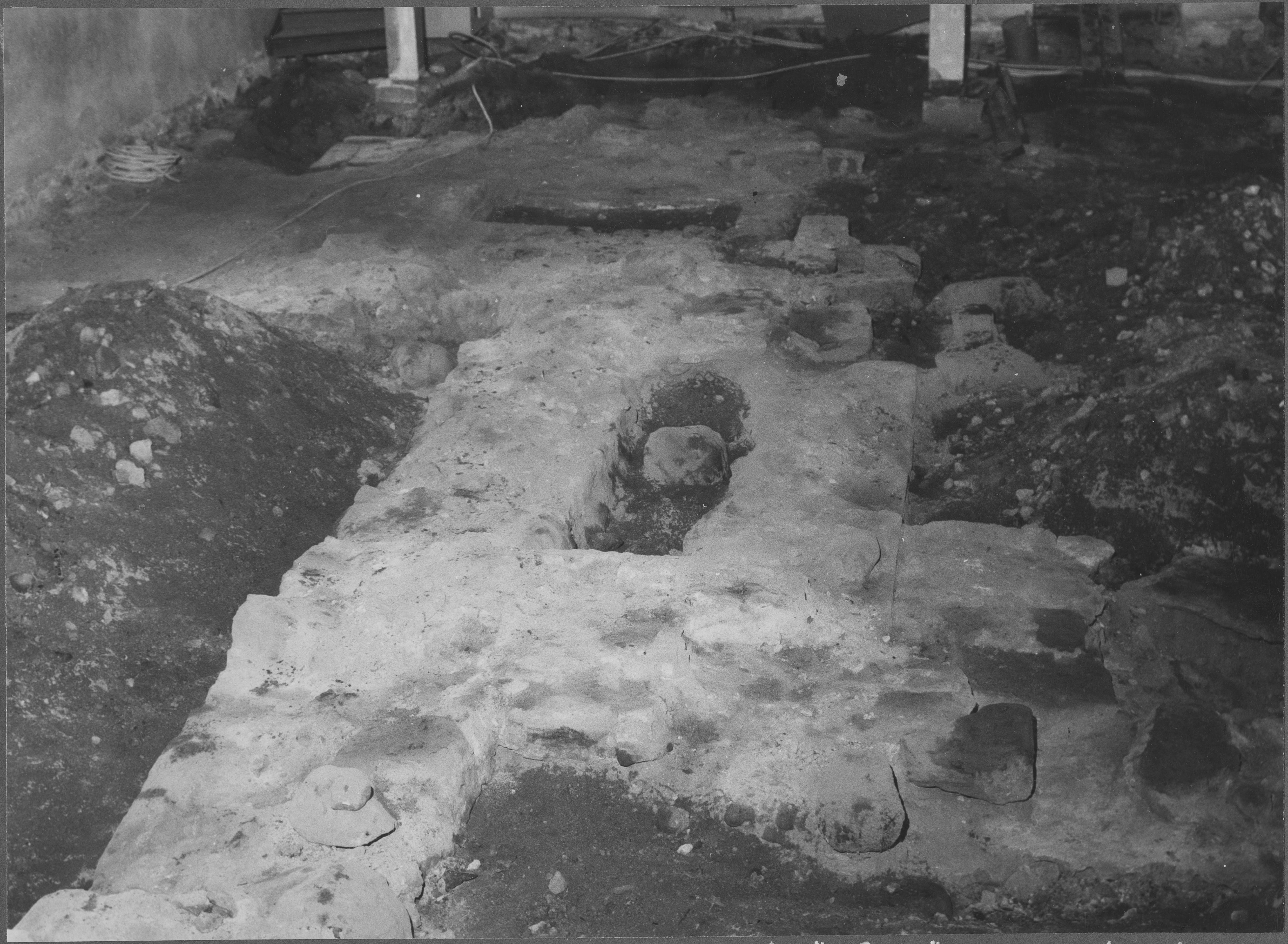 Beskrivning: Södra sidans äldre grundmurar från öster. Södra tvärbyggnaden till vänster, långhusmuren med förlängning samt till höger kormuren.