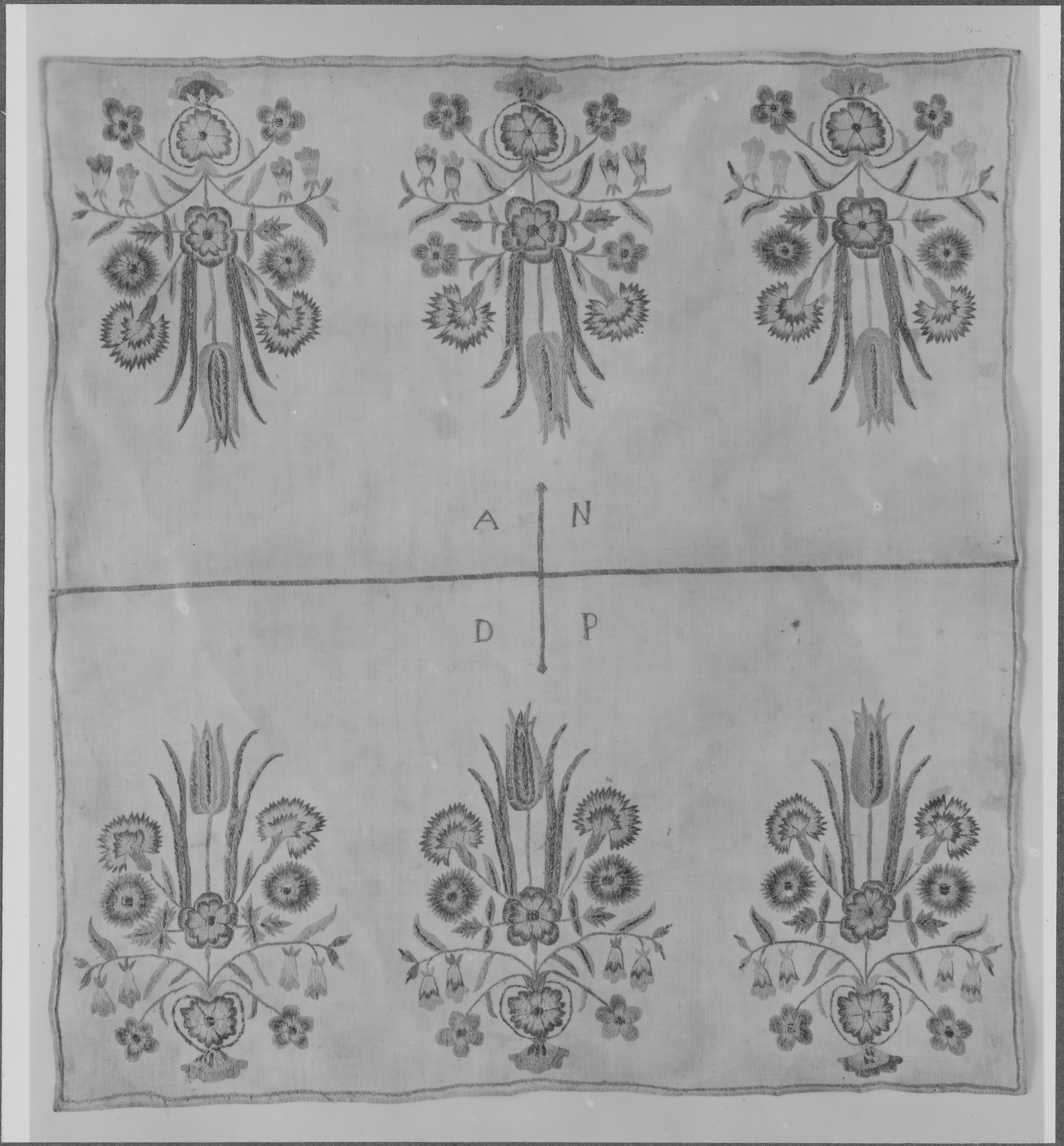 Beskrivning: Kalkduk (orientaliskt arbete) från 1600-t ? Pietas nr 2818/1949, efter konservering.