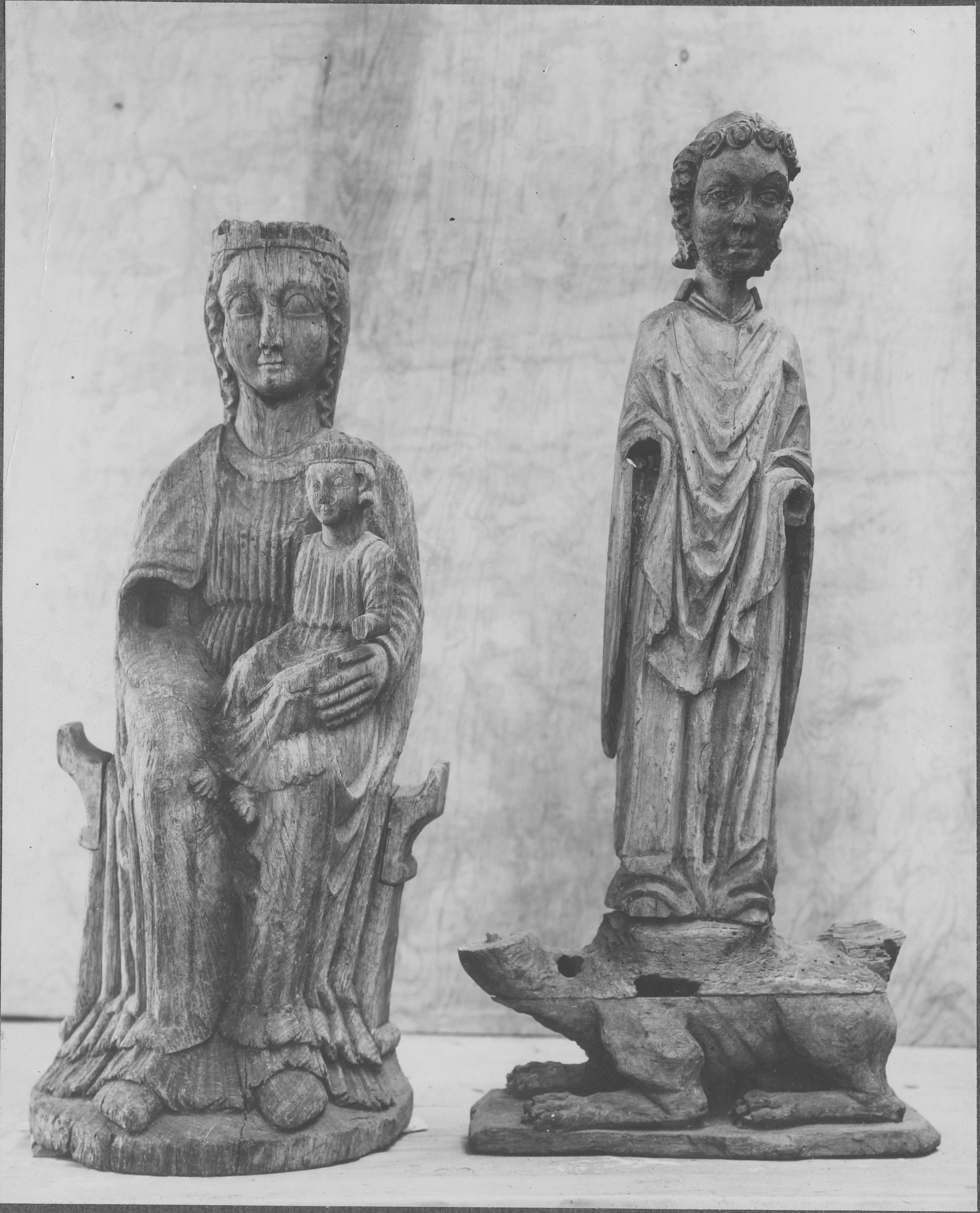 Beskrivning: Madonnaskulptur och Mikaelskulptur, av trä, från 1200-talet. Efter konservering.