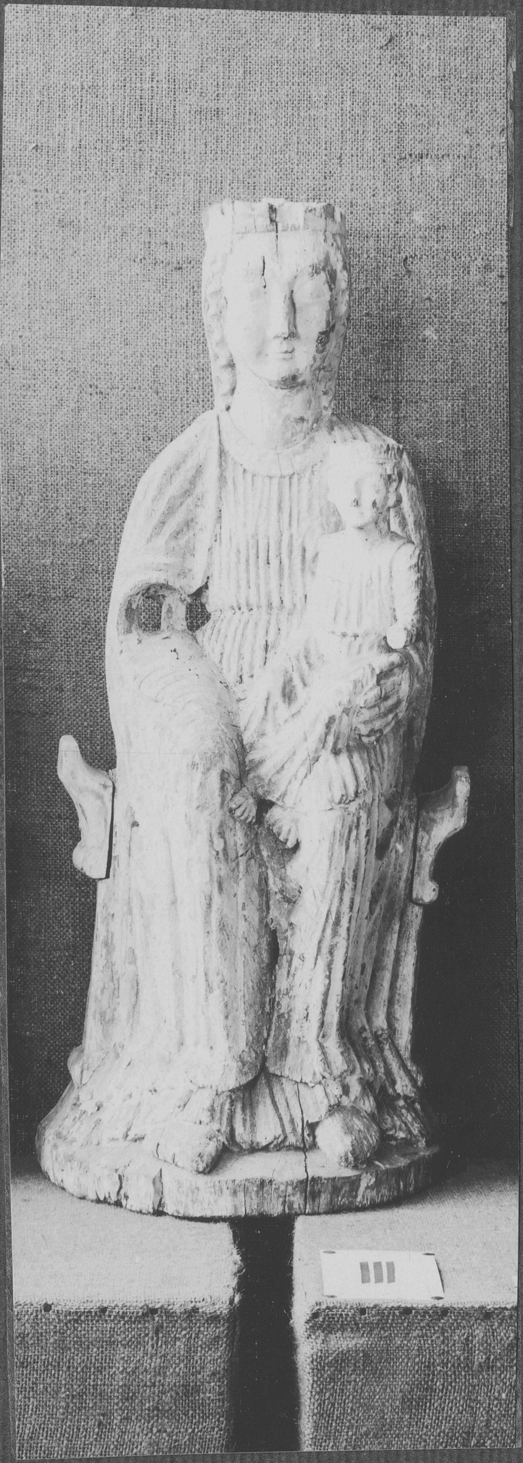 Beskrivning: Madonnaskulptur av trä, från 1200-talet. Från Norrköpingsutställningen1906.