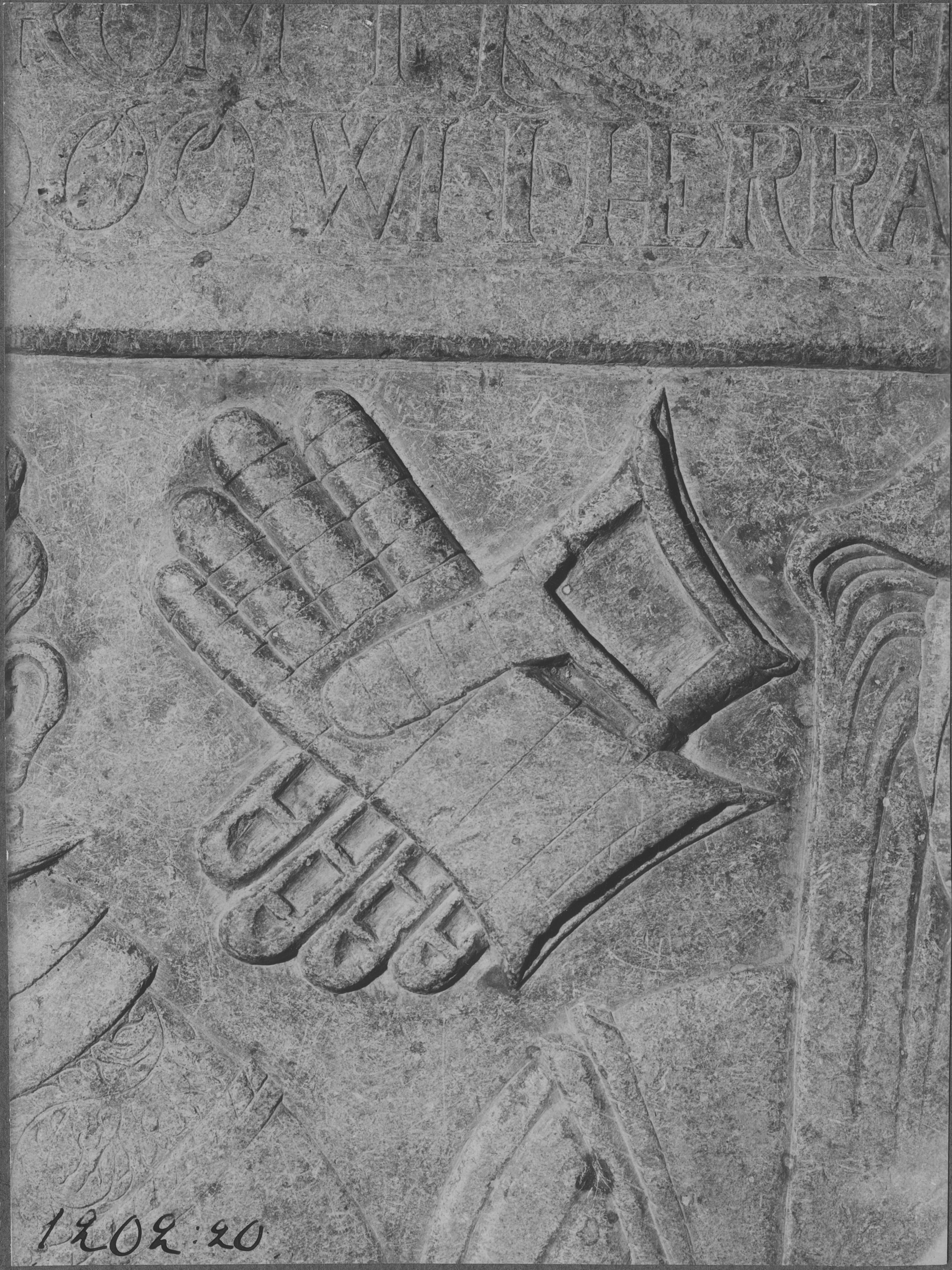 Beskrivning: Detalj av gravsten över Nils Nilsson Natt och Dag (d 1613) och Anna Bengtsdotter (d 1603).
