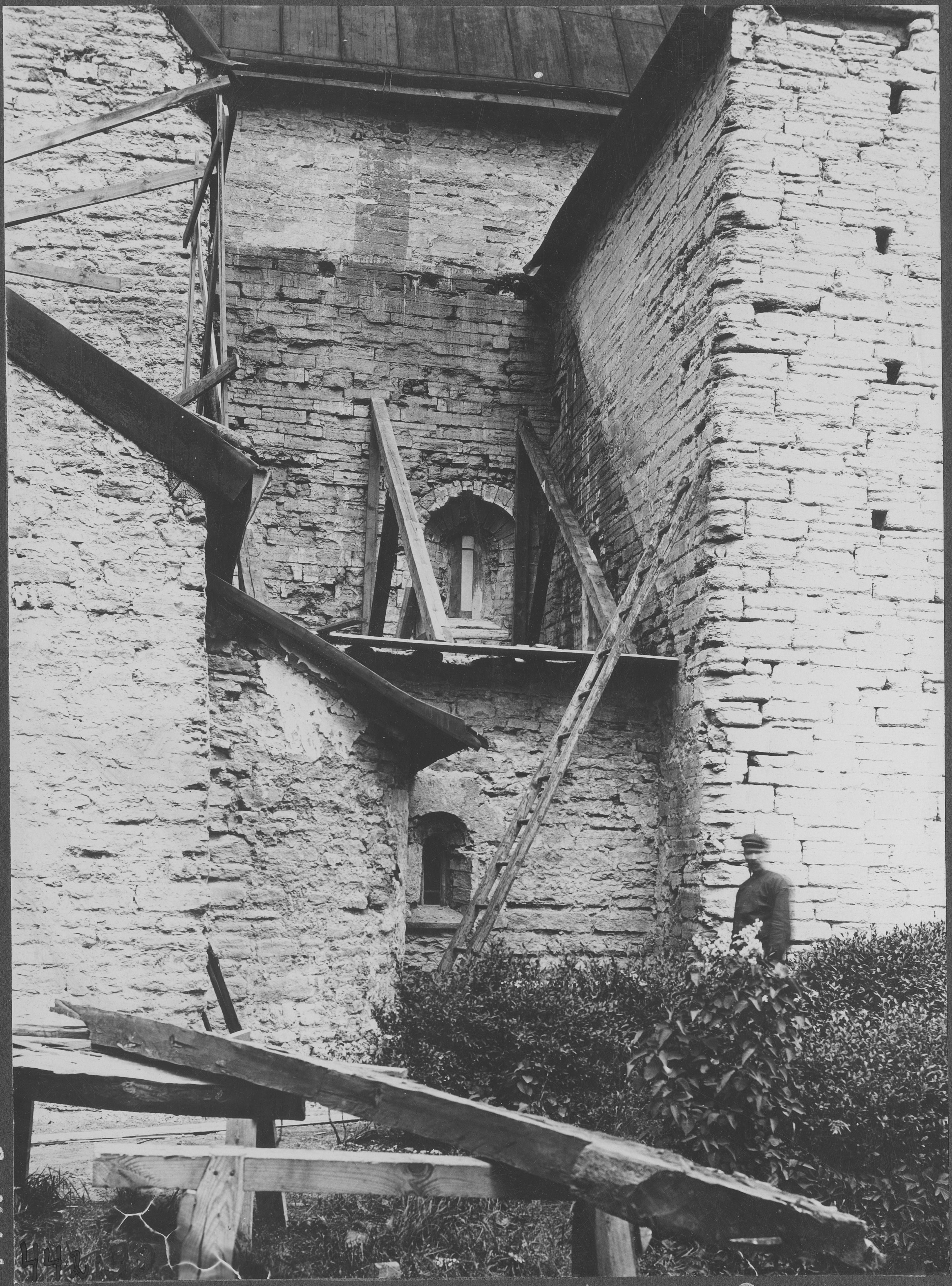 Beskrivning: Detalj av södra fasaden och Magnus Nilssons gravkor. Gamla taket borttaget. Fönster till koret synligt härunder.