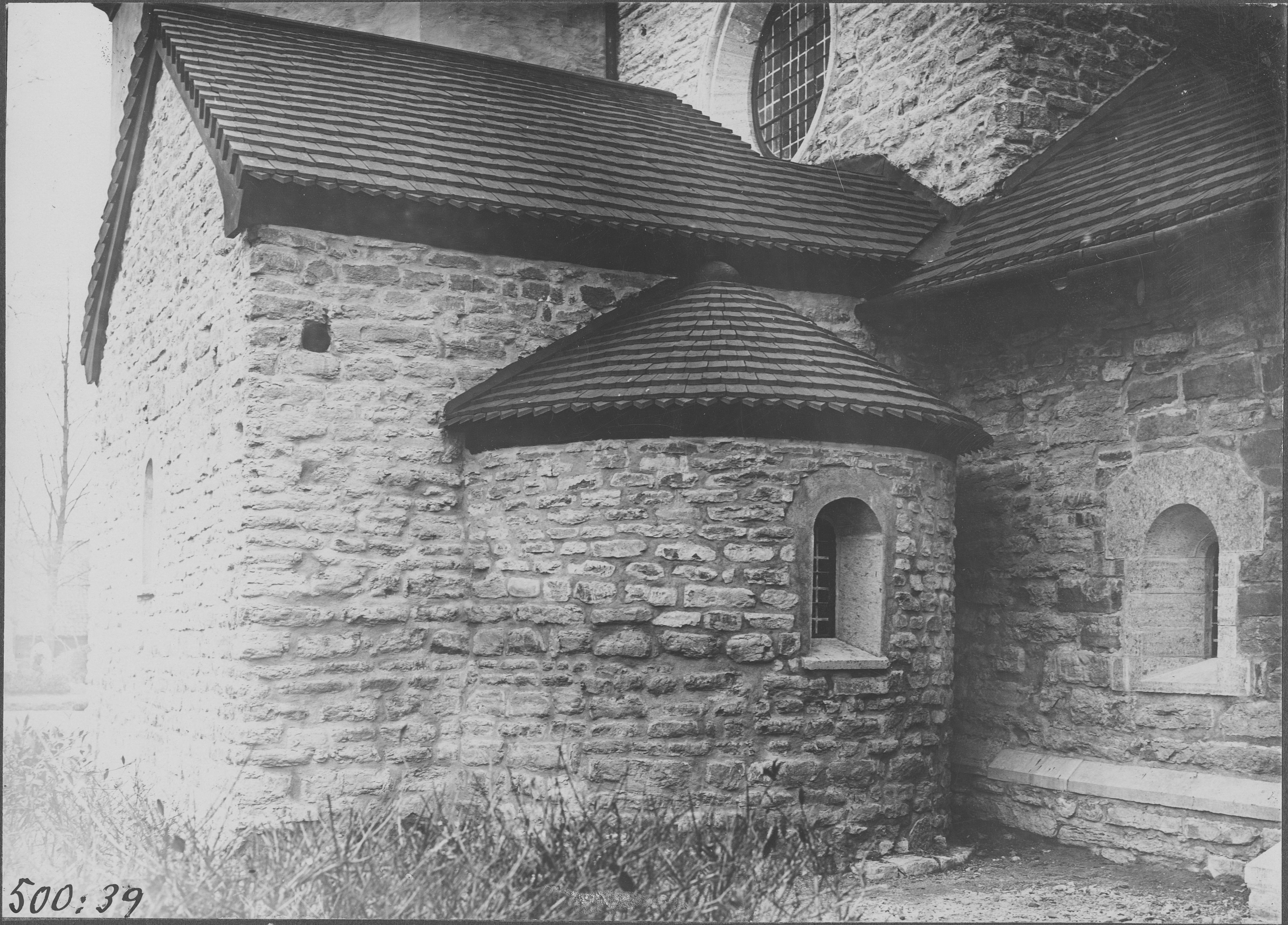Beskrivning: Ragvald Knaphövdes gravkor från sydöst med återuppförd absid, samt Magnus Nilssons gravkor.