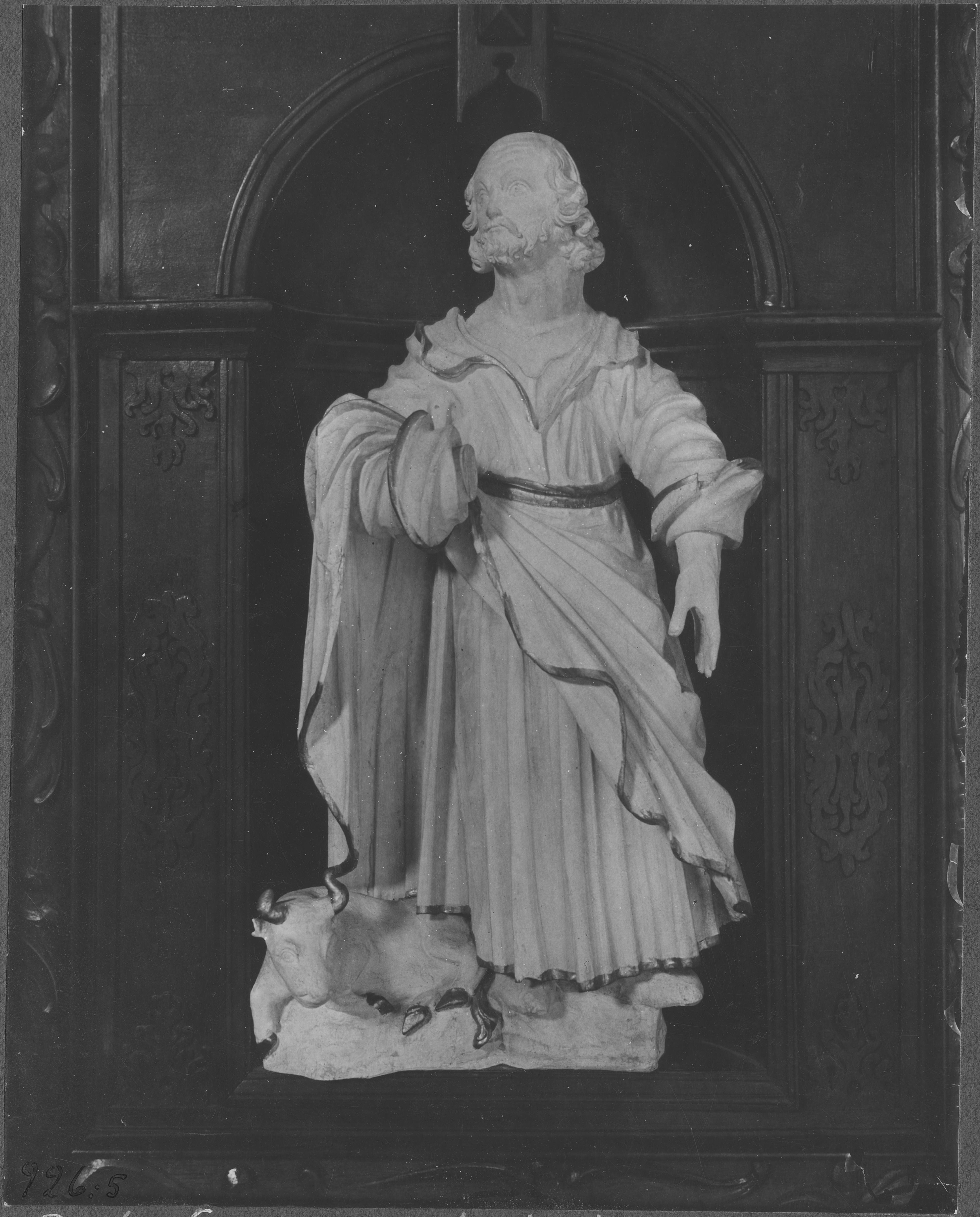 Beskrivning: Detalj av predikstolen, evangelisten Lukas.