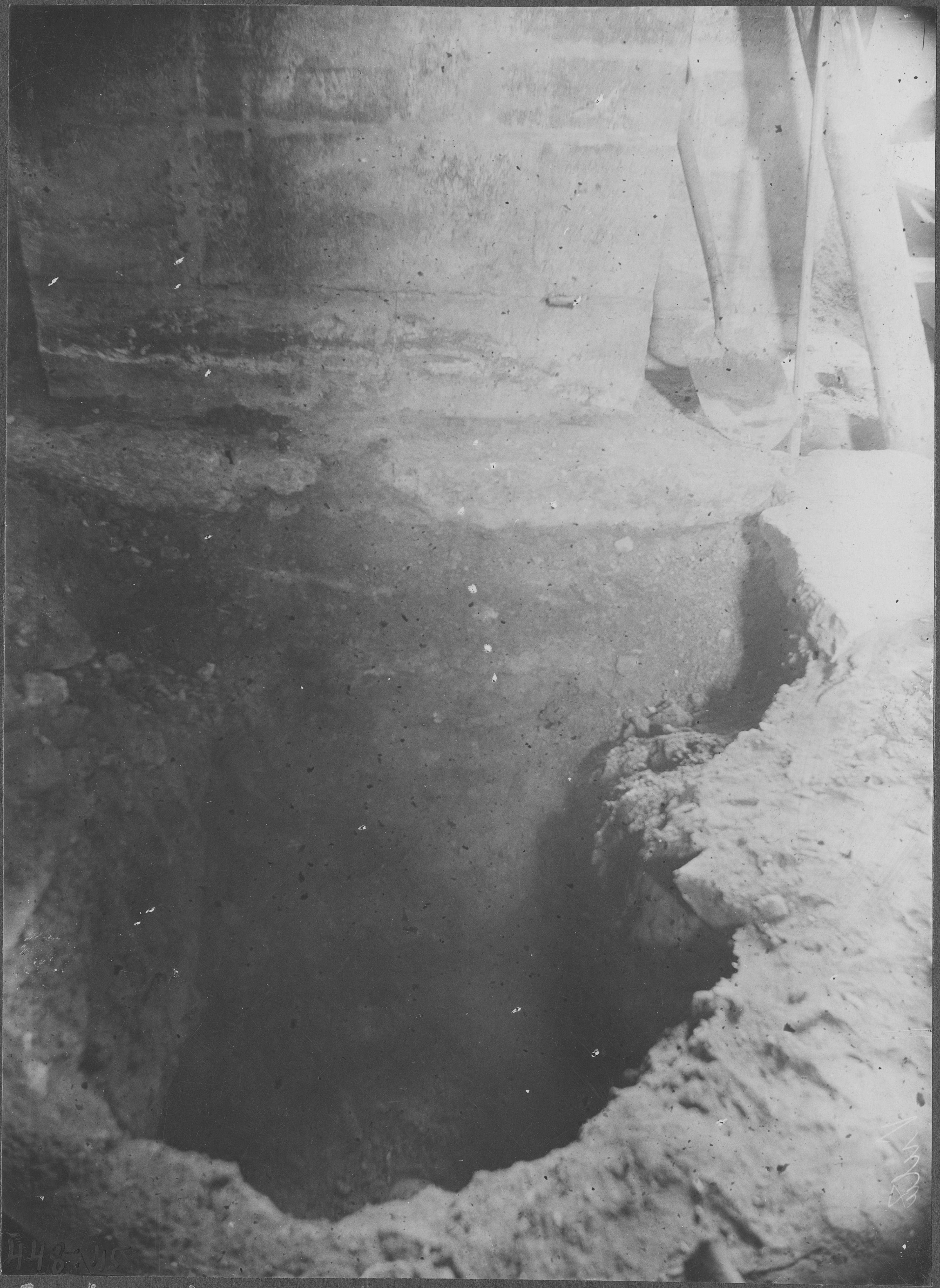 Beskrivning: Spår av grundmur under äldsta kyrkans västra mur från norr.