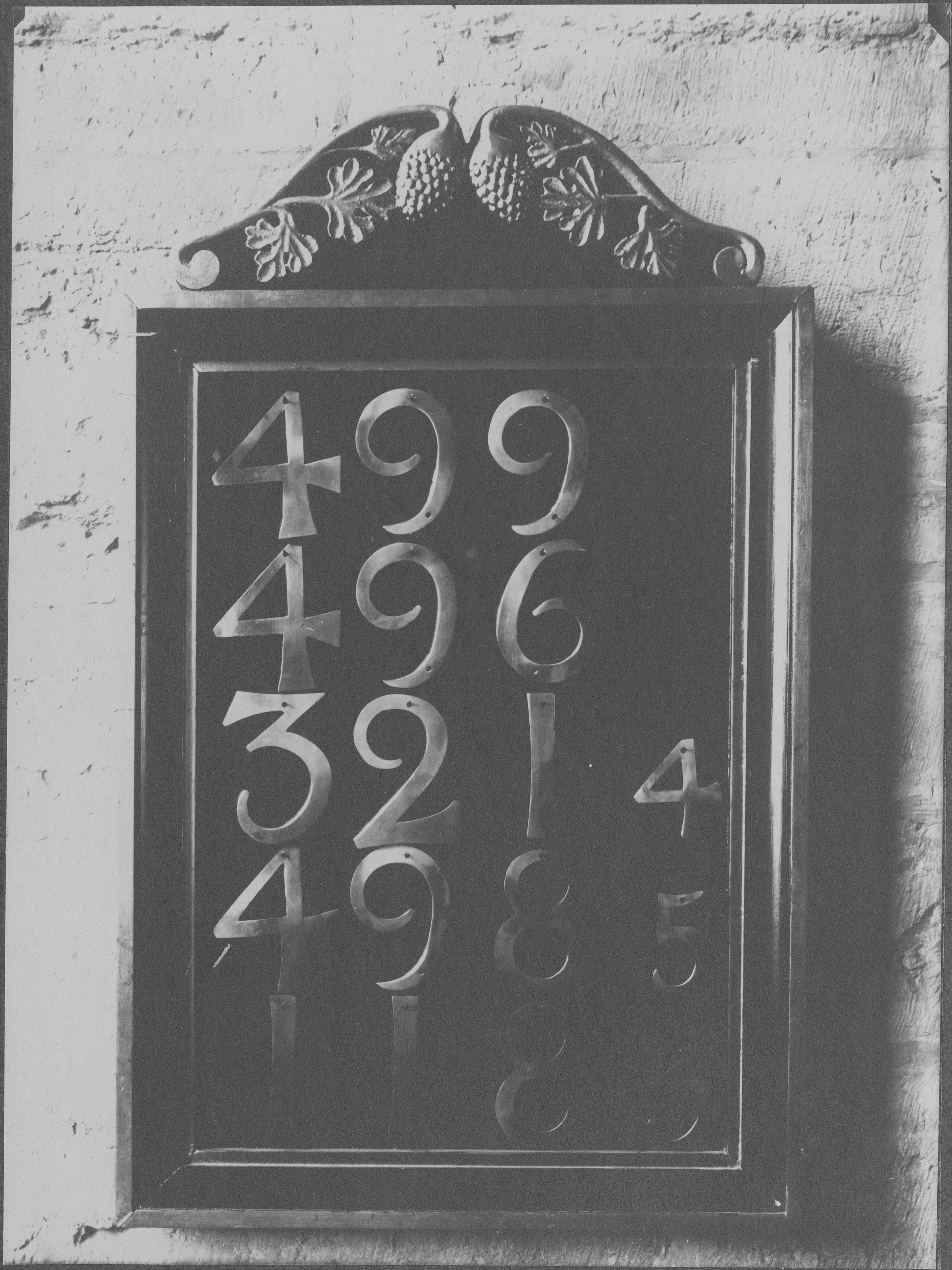 Beskrivning: Nummertavla från 1790. Fotot troligen från 1920-talet.