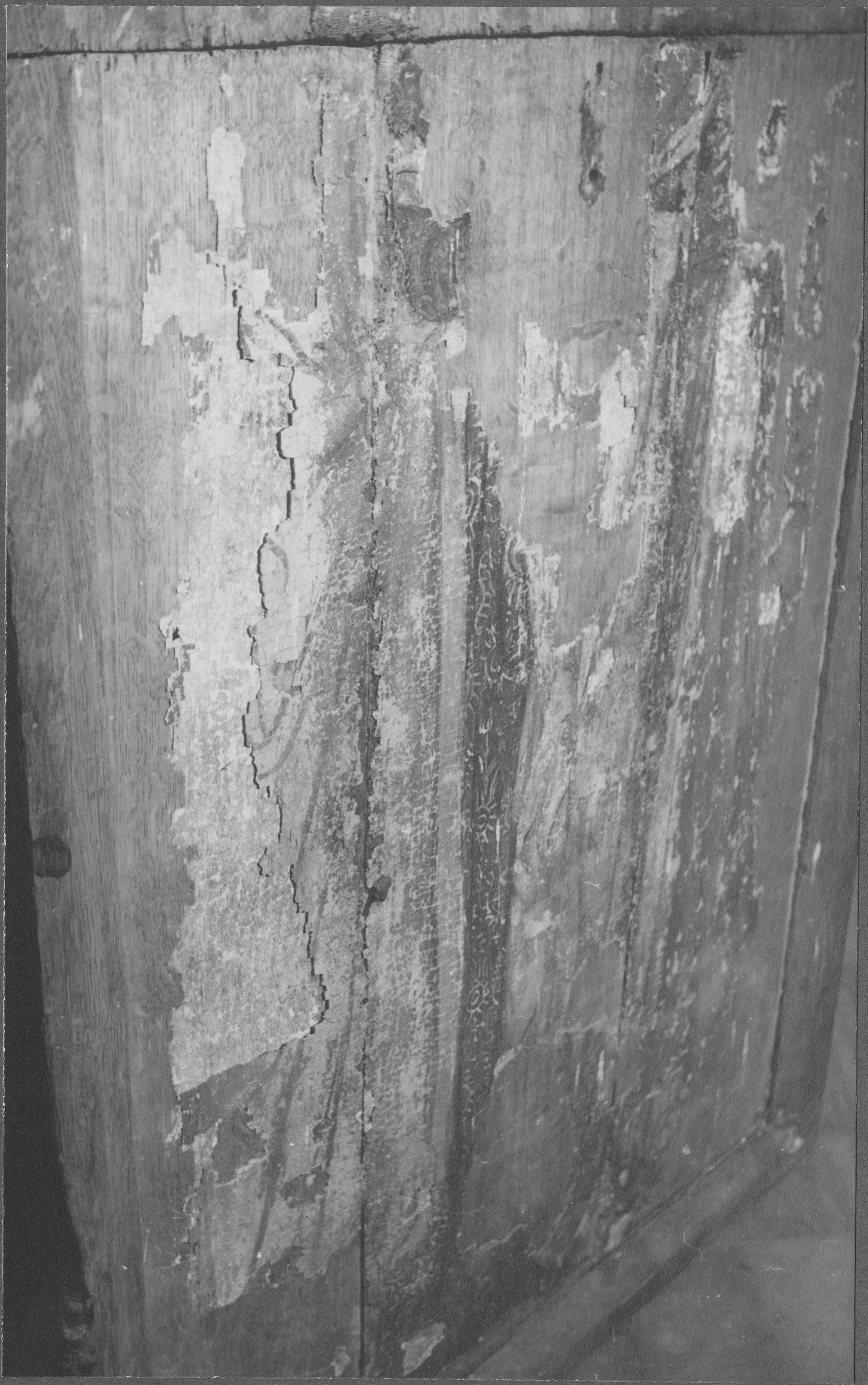 Beskrivning: Baksida av en av altarskåpets flyglar. Före konservering.