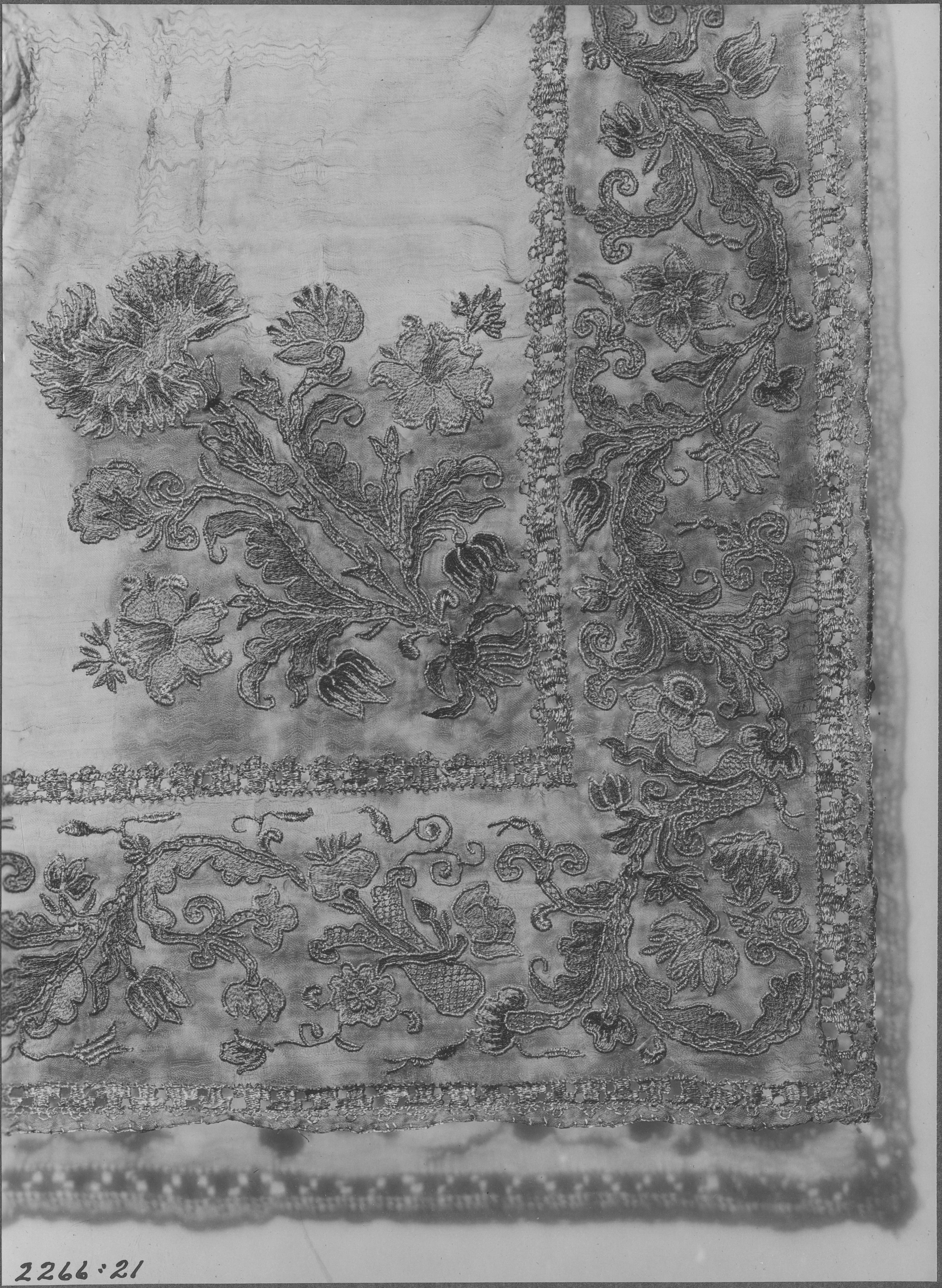 Beskrivning: Kalkduk från 1600-talet (?) med turkiskt broderi. Foto från utställningen vid SHM om orientaliska broderier 1945.