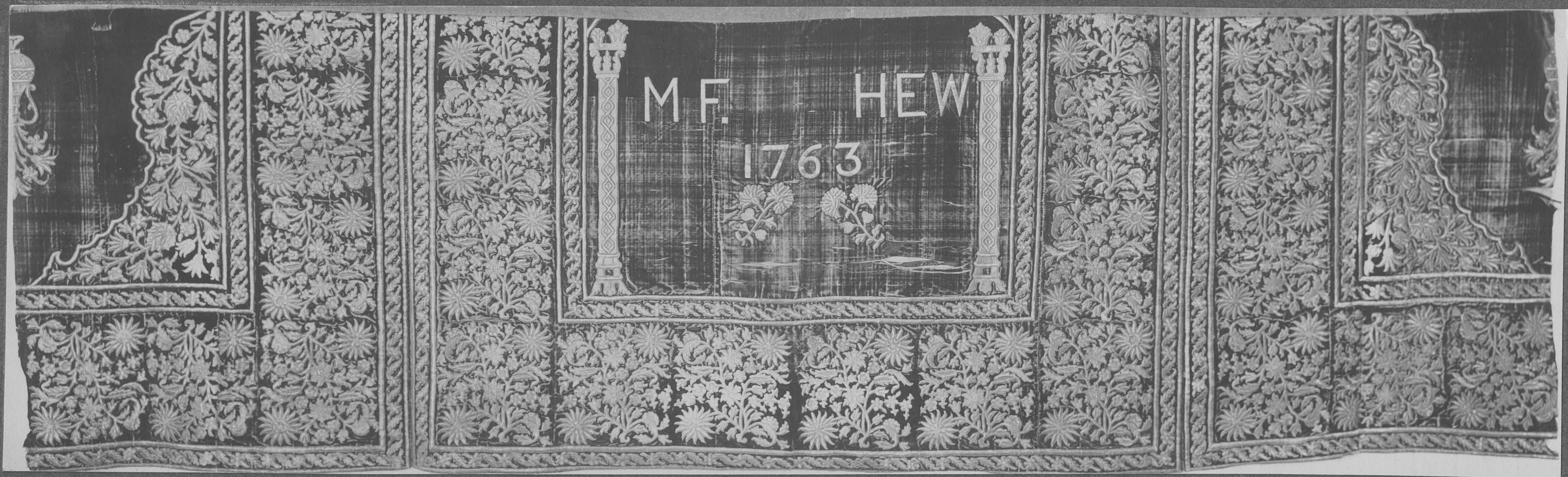 Beskrivning: Antependium i röd sammet med guldbroderi, daterat 1763, med bokstäverna MF. samt HEW. Foto efter konservering vid Pietas, nr 755/1923.