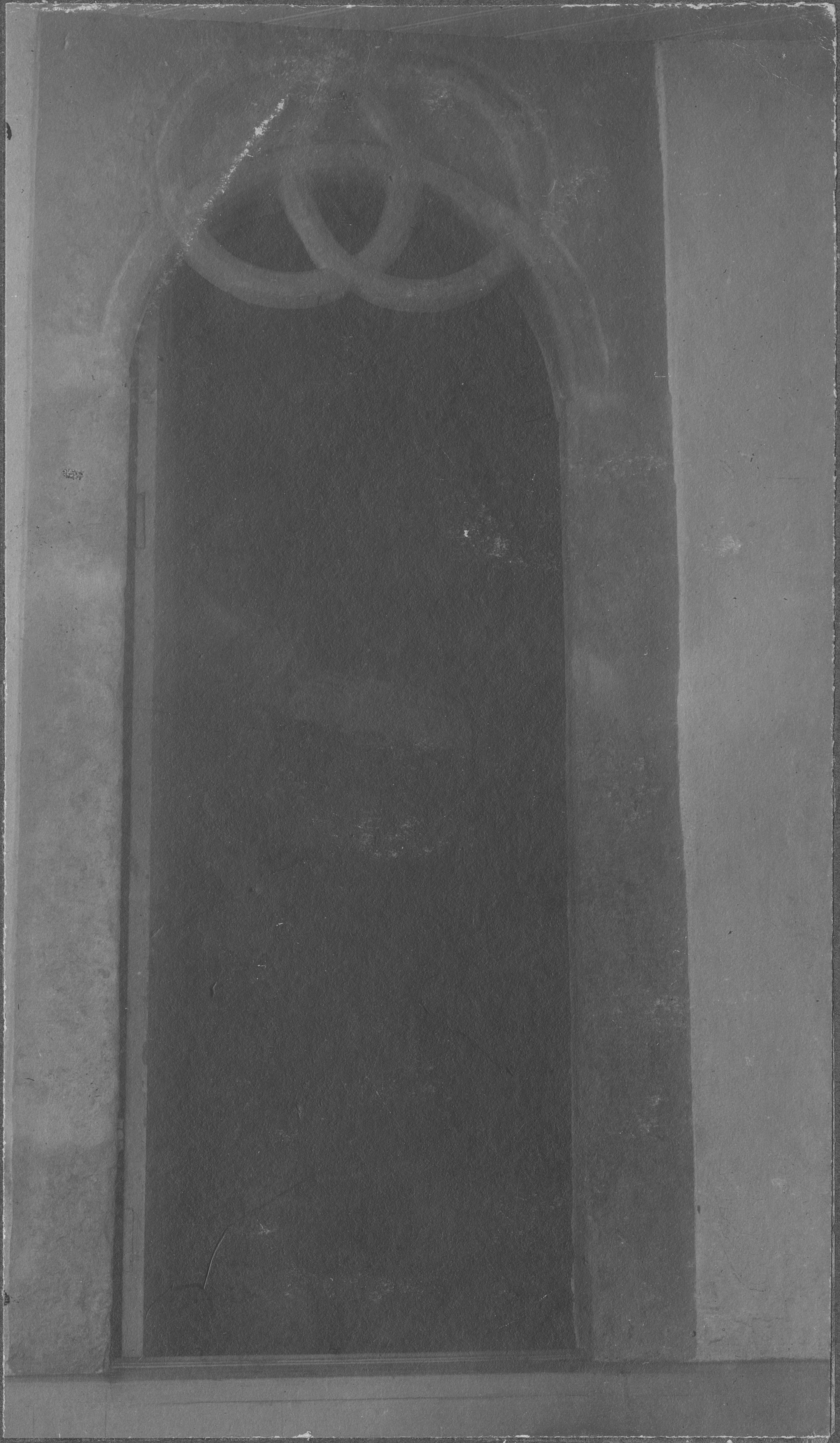 Beskrivning: Medeltida kalkstensportal från rundkyrkans nordvästra innervägg, nu i vapenhuset.