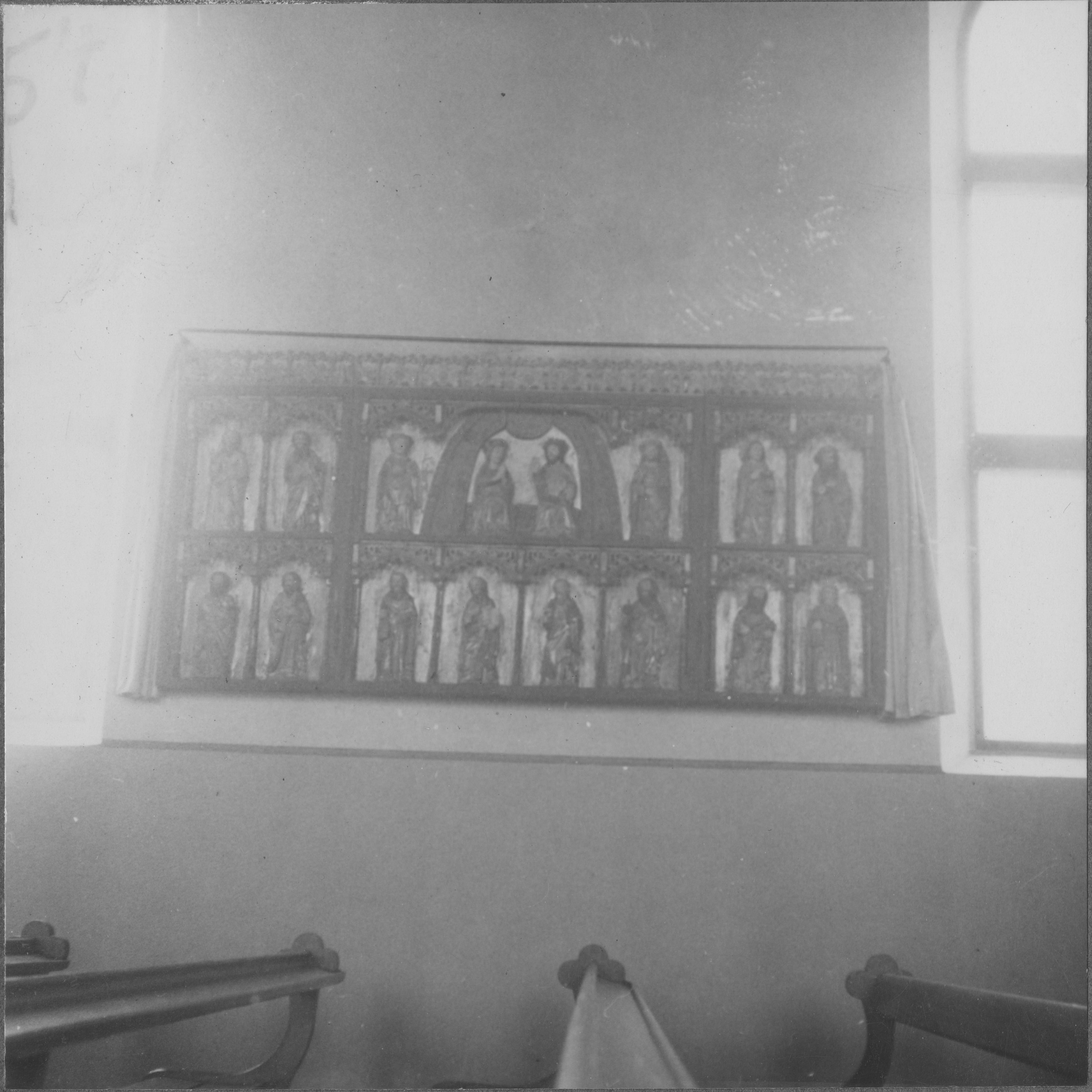 Beskrivning: Medeltida altarskåp på den södra väggen.