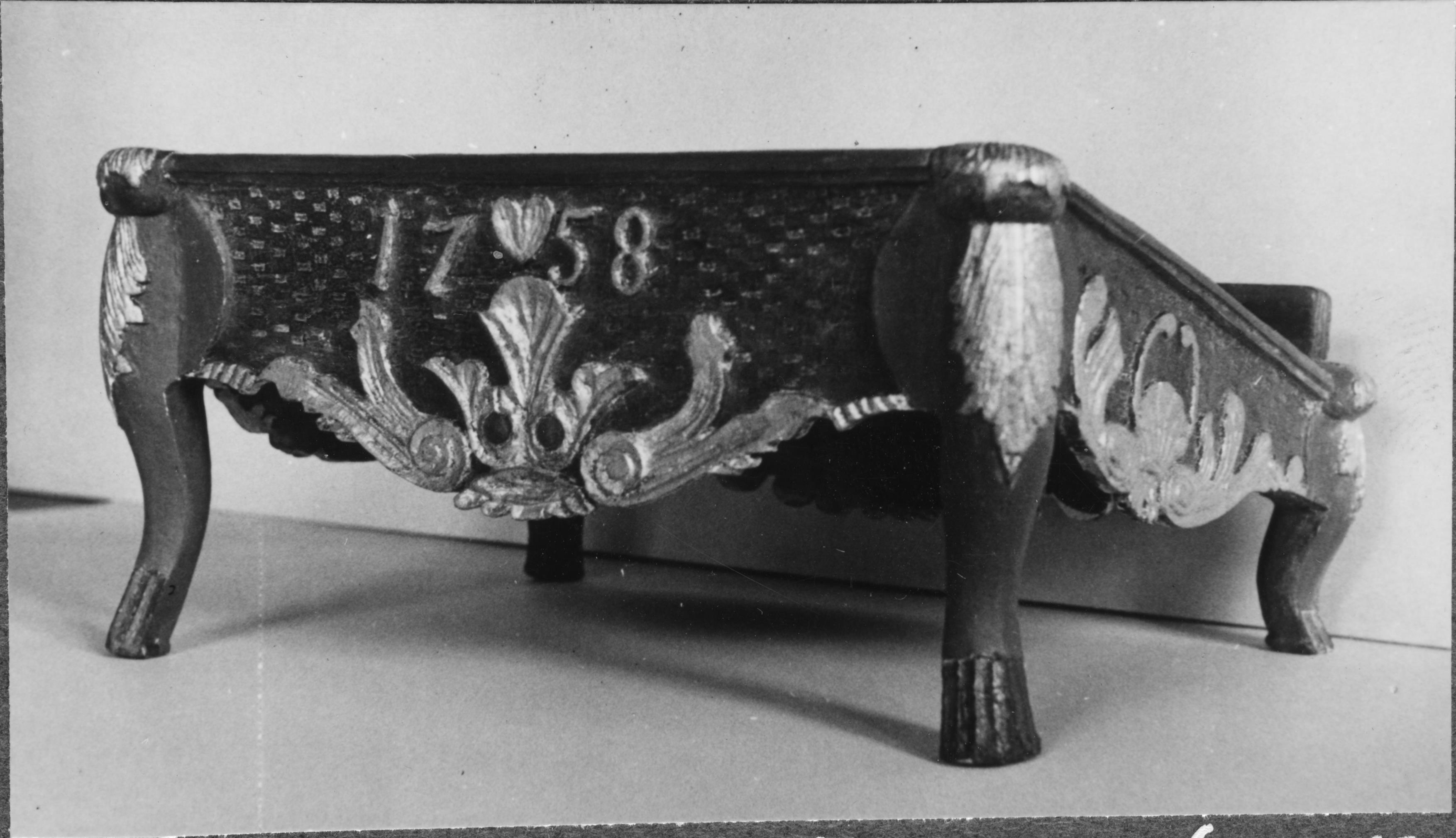 Beskrivning: Bokpall, av trä. Svängda ben med snidade blad. Inskrift 1758. Efter restaurering.