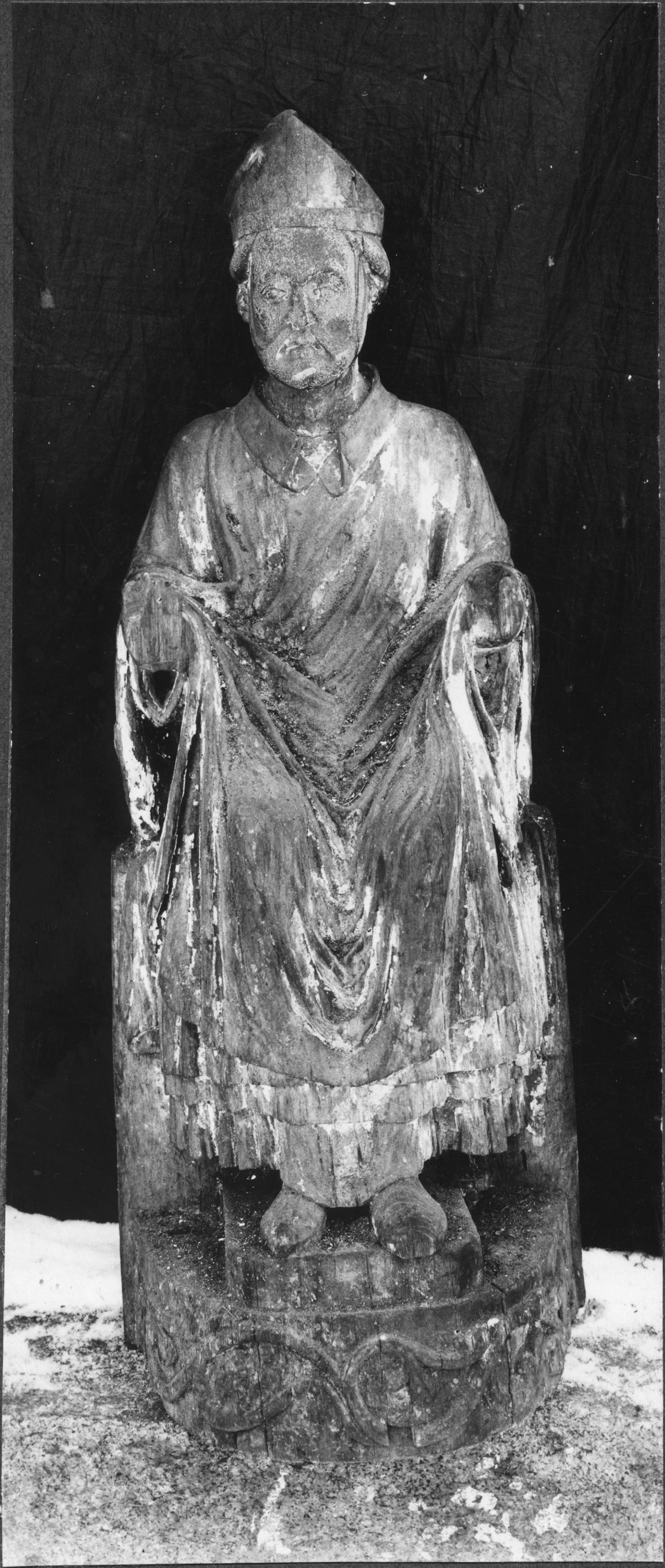Beskrivning: Träskulptur, biskop, sittande. På sockeln en romansk bladranka. Omkring 1300 (snabbinv).