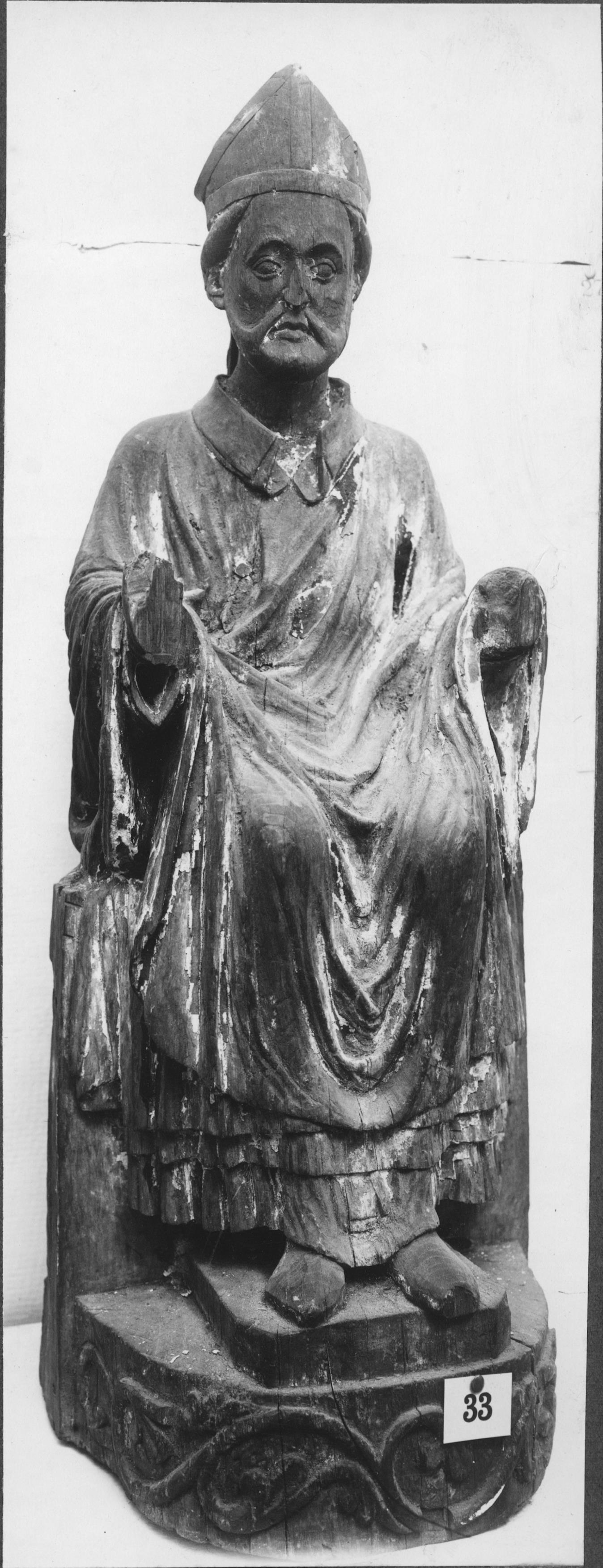 Beskrivning: Träskulptur, biskop, sittande. På sockeln en romansk bladranka. Omkring 1300 (snabbinv).