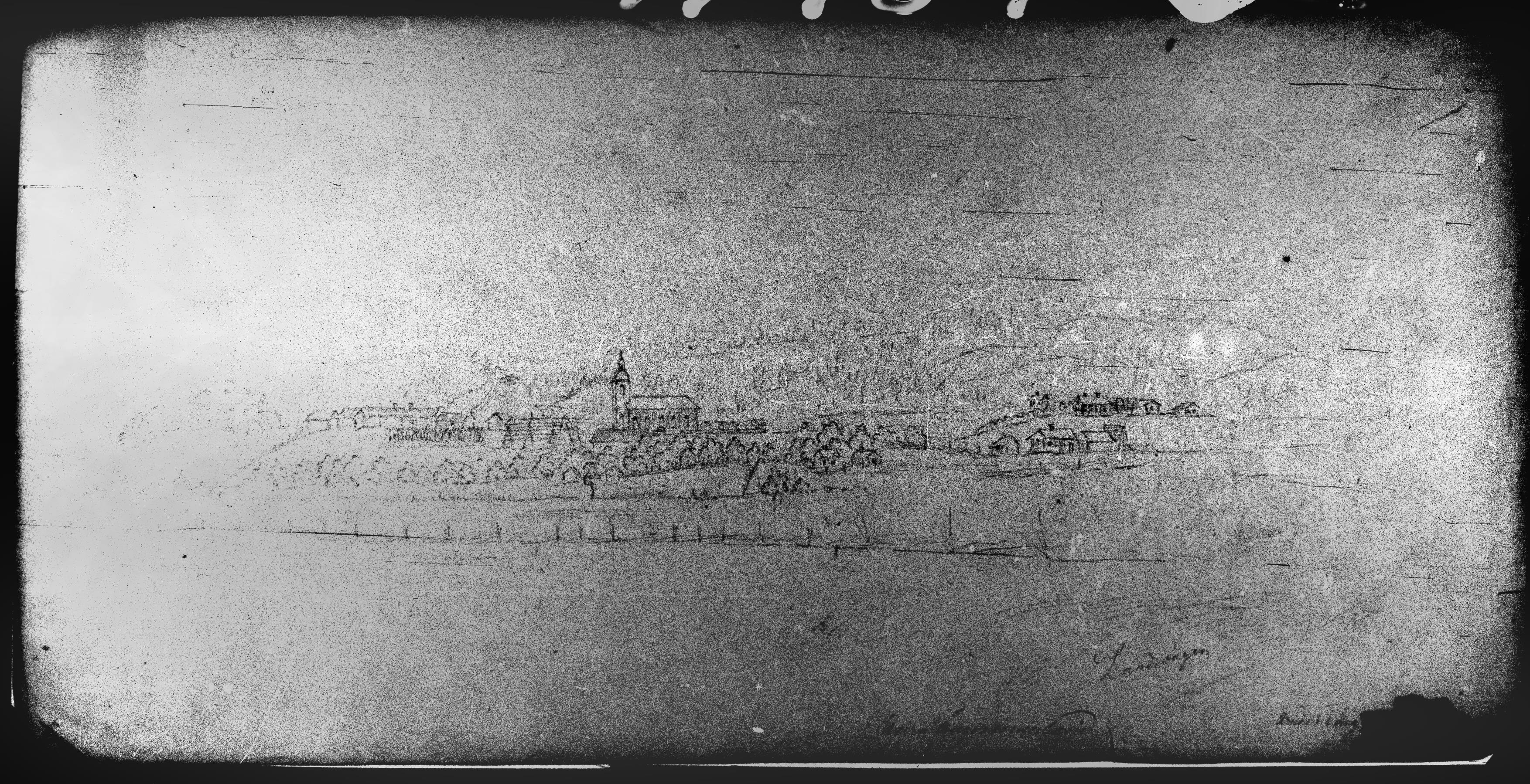 Beskrivning: Fotografi av teckning över kyrkan med omnejd. Ur C J F Plagemanns resor, nr 5.