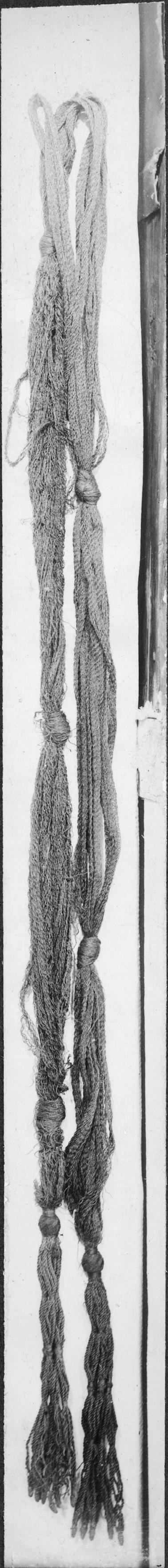 Beskrivning: Gördel. Sammansatt av knutna band av rött redgarn med tofsar. På jämna avstånd hopdraget med knutar. L. 124 cm. Har använts till mässkjorta. Härnösandsutst. 1912 nr. 306.