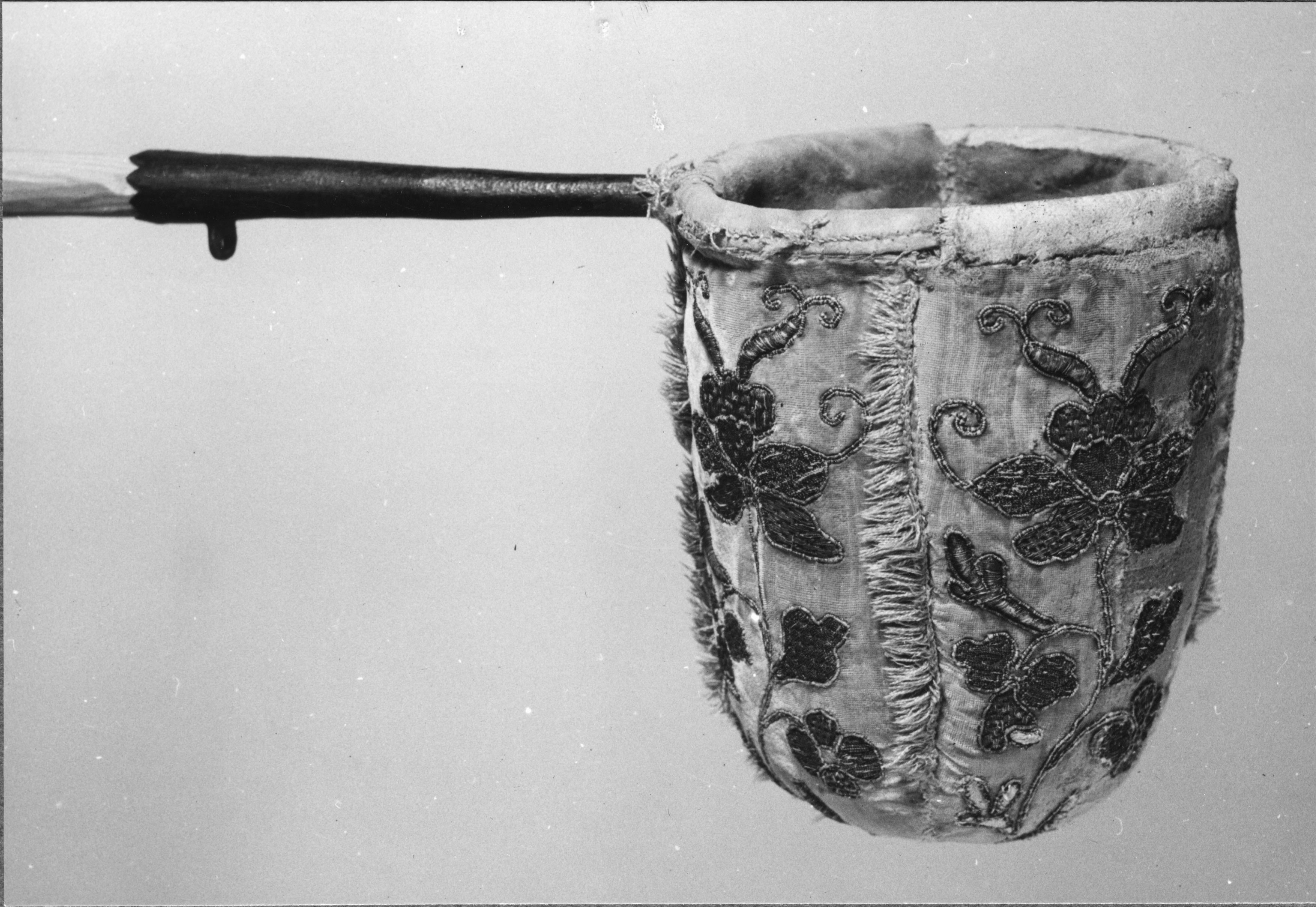 Beskrivning: Håv, klädd med blå taft med guldbroderier samt försedd med liten malmklocka och träskaft. Skänkt till kyrkan 1722. Efter konserv.