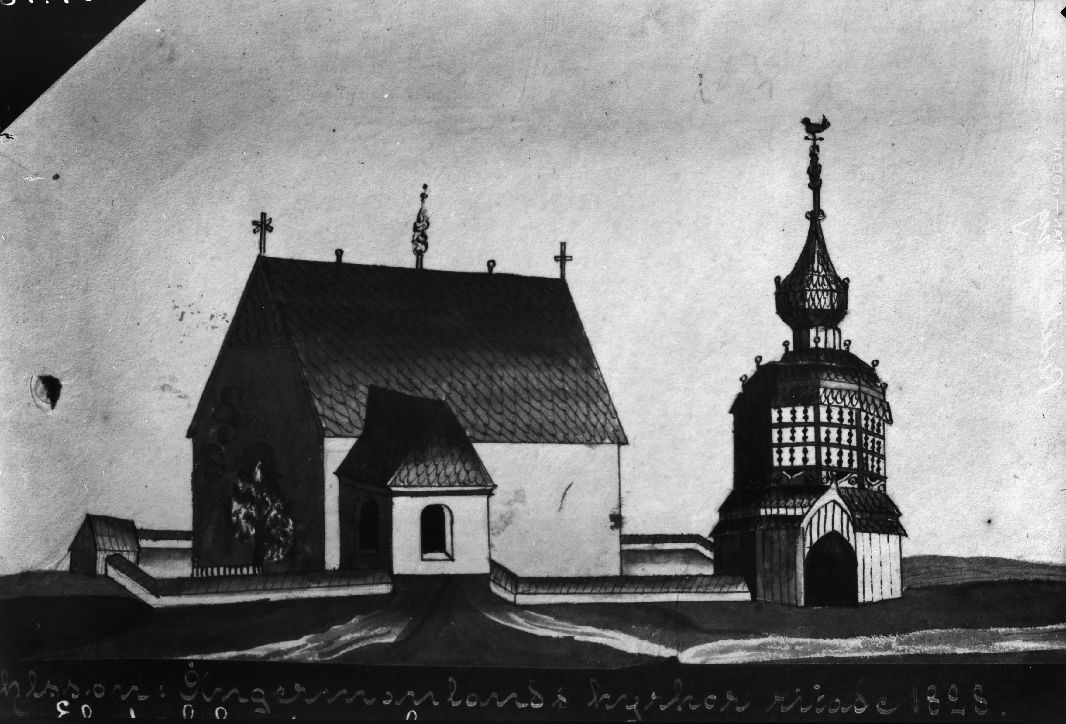Beskrivning: Resele gamla kyrka. Teckning ur Ohlson: "Ångermanlands kyrkor ritade 1828". Ekdahls samling.