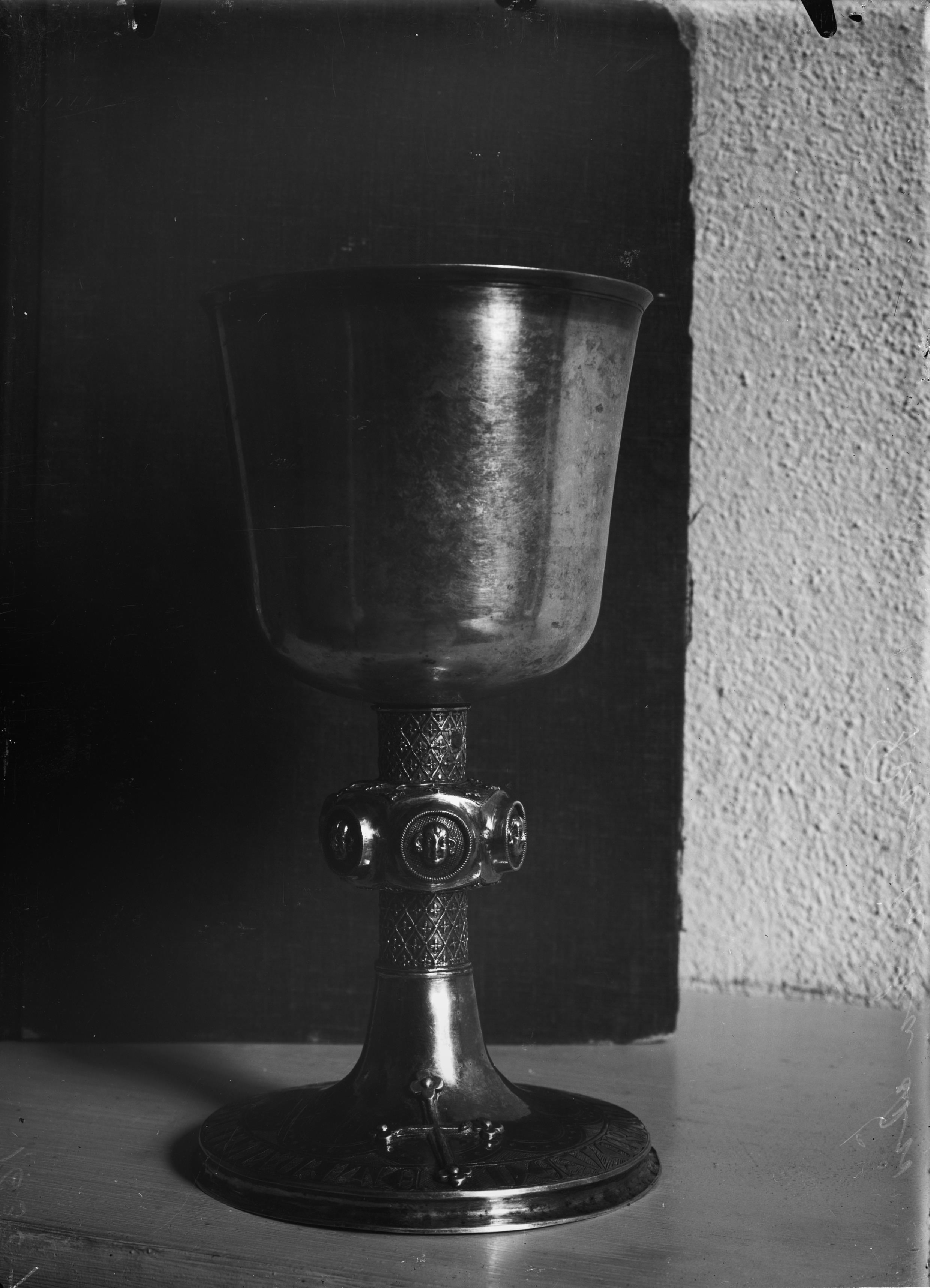 Beskrivning: Kalk av silver, fot och skaft förgyllda. På foten fastnitat kors och spår efter en förr fastlödd, nu förlorad Kristusbild på detta. På skaftet rutverk med kors i rutorna. På knappen gotiska blad och sex änglahuvuden. H. 23,3 cm. Fot med skaft från 1300-talet. Snabbinventering.