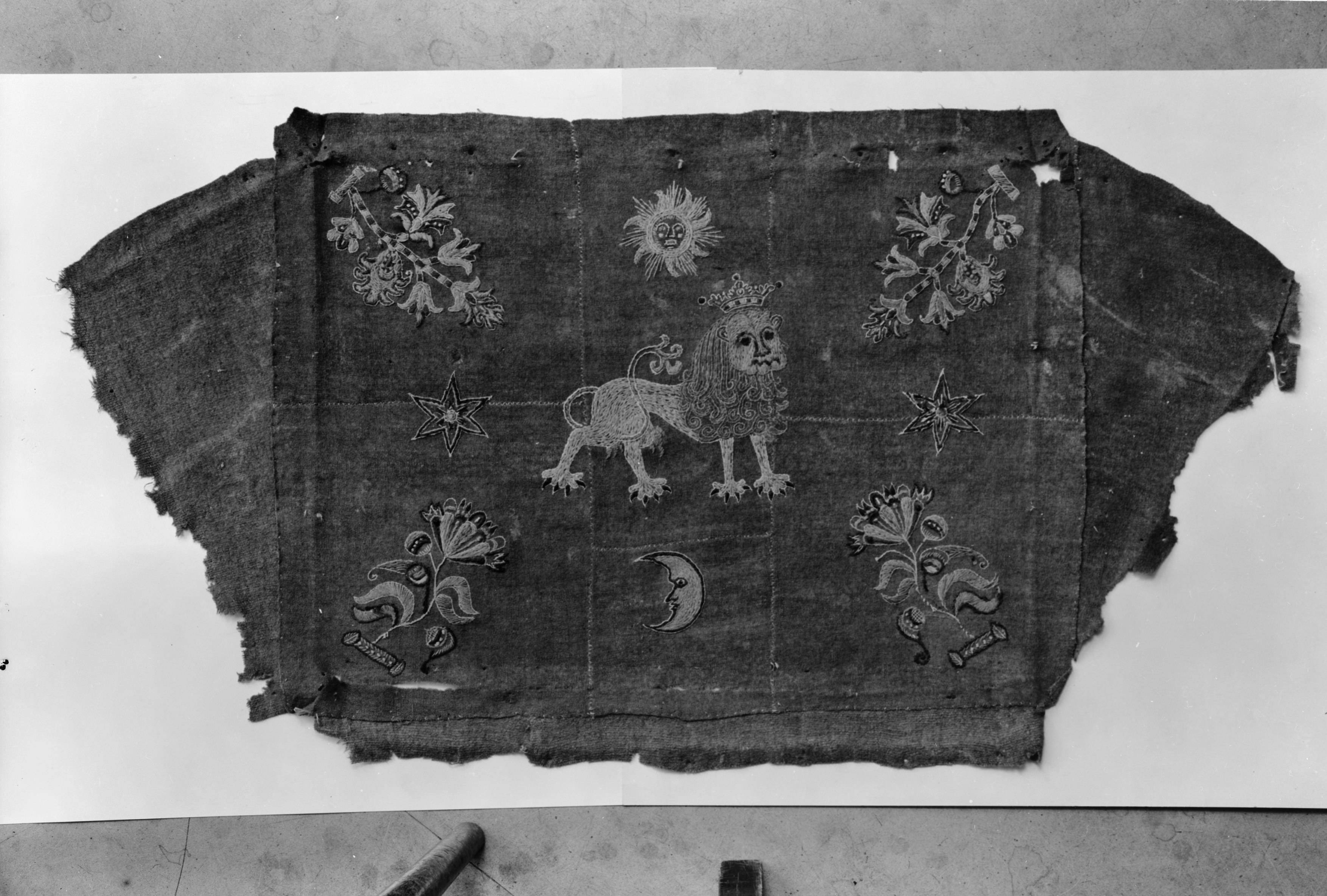 Beskrivning: Bokpall av rött kläde. Broderi i guld, brunt, svart och vitt; i mitten krönt lejon. Pallens överyta 38x50 cm. Omkr. 1600. Före renovering.