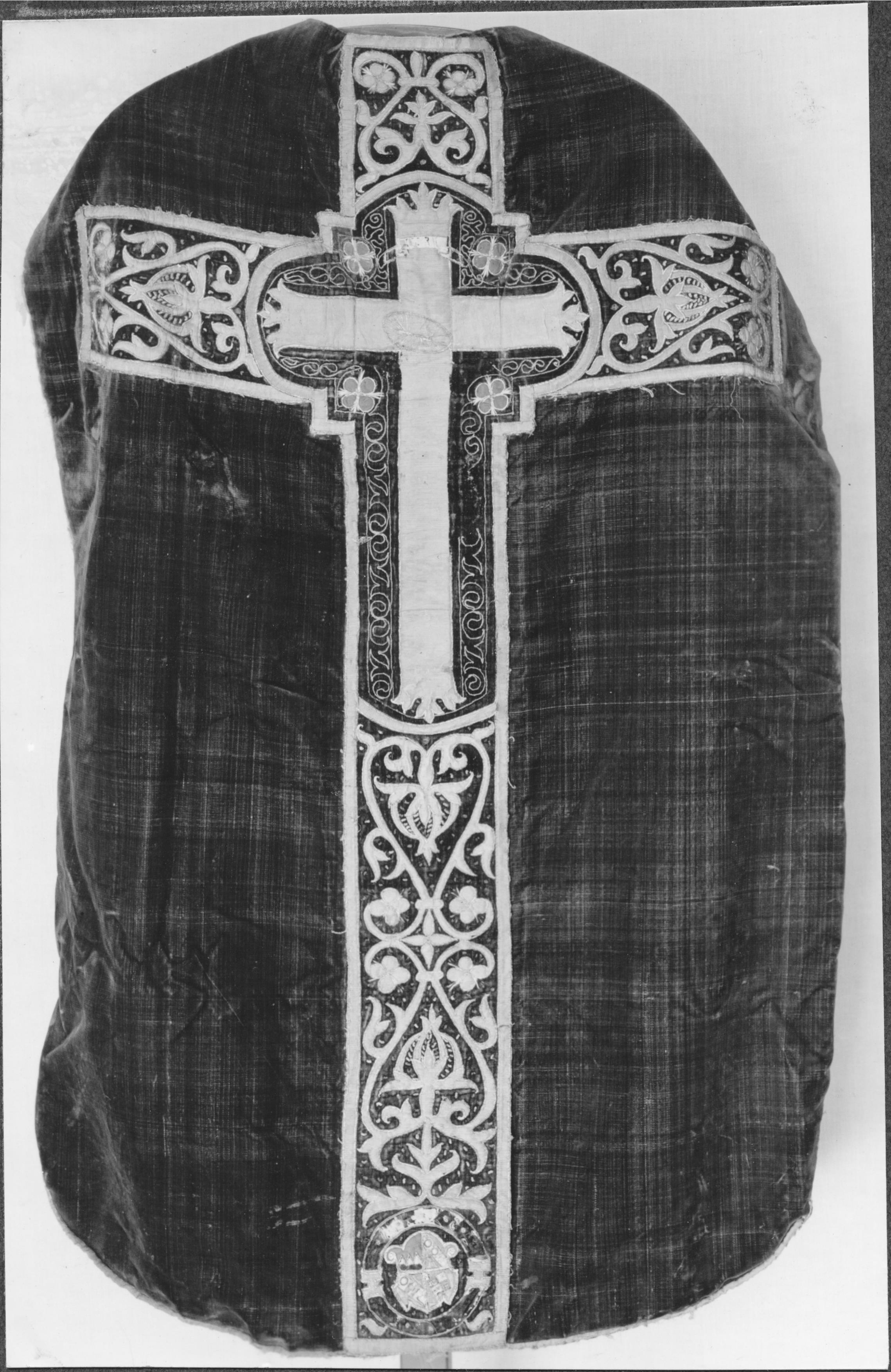 Beskrivning: Mässhake av röd sammet, fodrad med urblekt ljusblå lärft. Ryggstycket dekorerat med kors av grön sammet med korsapplikation och ornament i guldrips samt broderi med silvertråd. Längst ned på korset ett vapen. Före renovering.