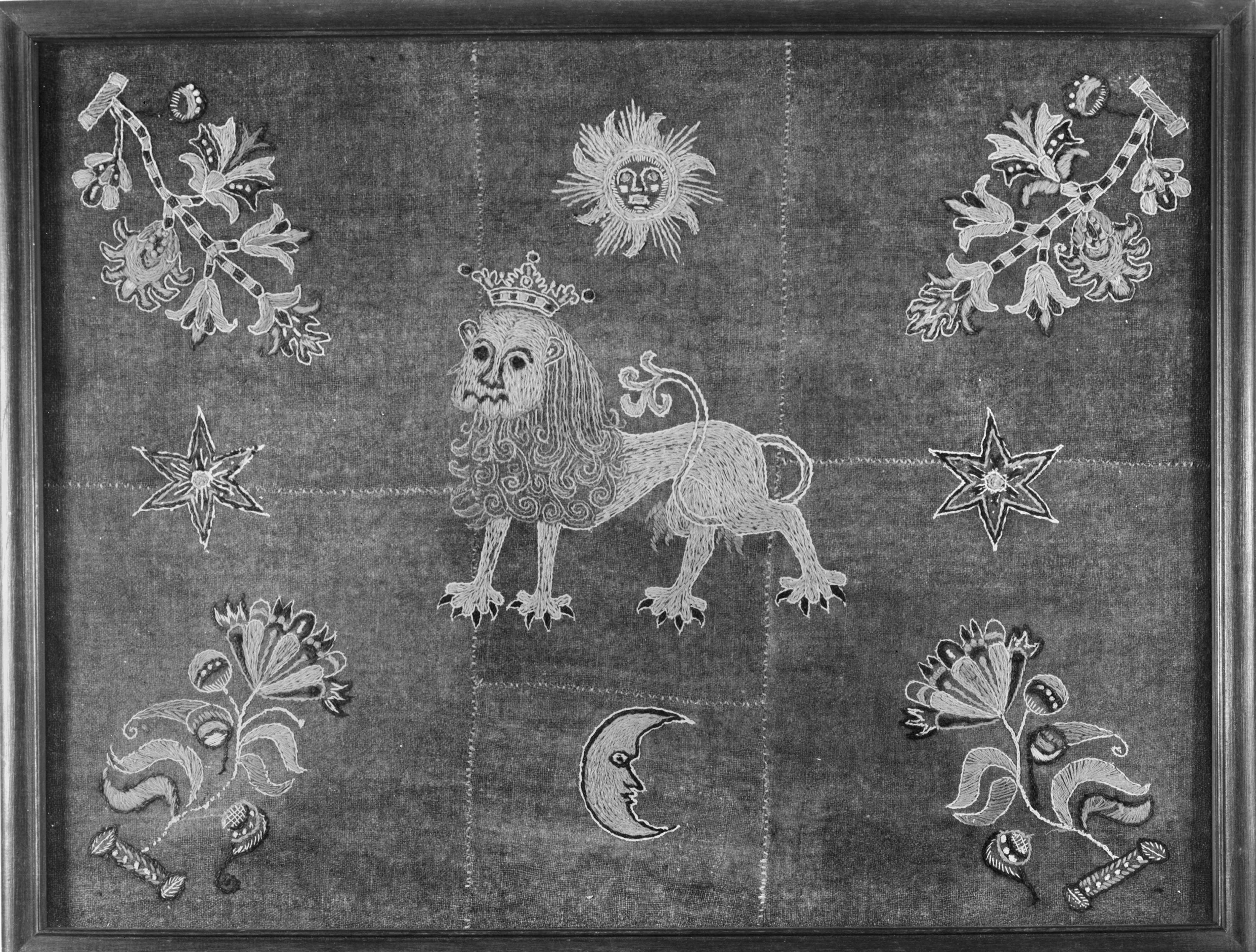 Beskrivning: Bokpall av rött kläde. Broderi i guld, brunt, svart och vitt; i mitten krönt lejon. Pallens överyta 38x50 cm. Omkr. 1600.Efter renovering.