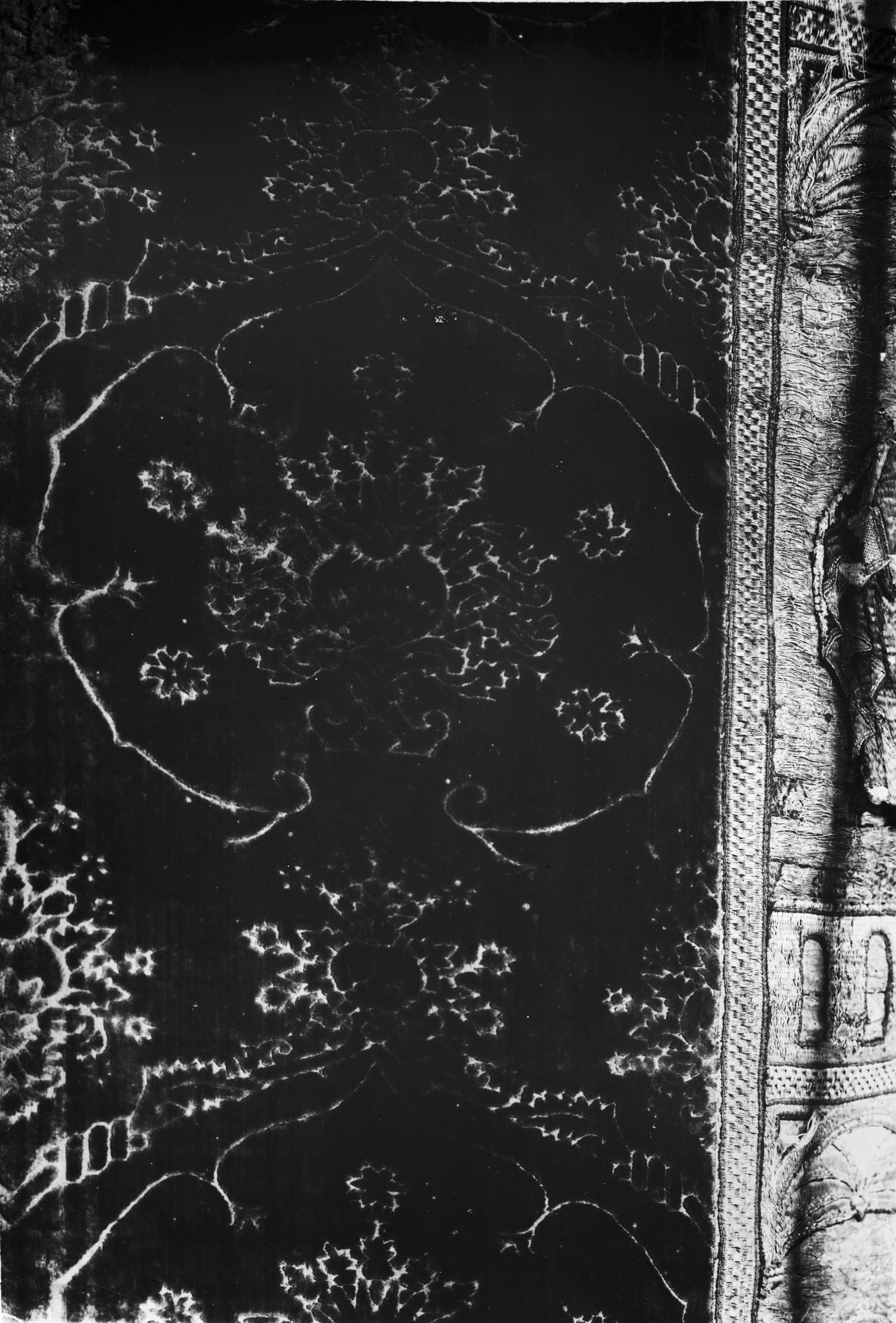 Beskrivning: Mässhake av grön sammet, skuren i granatäpplemönster. Detalj av mönster.