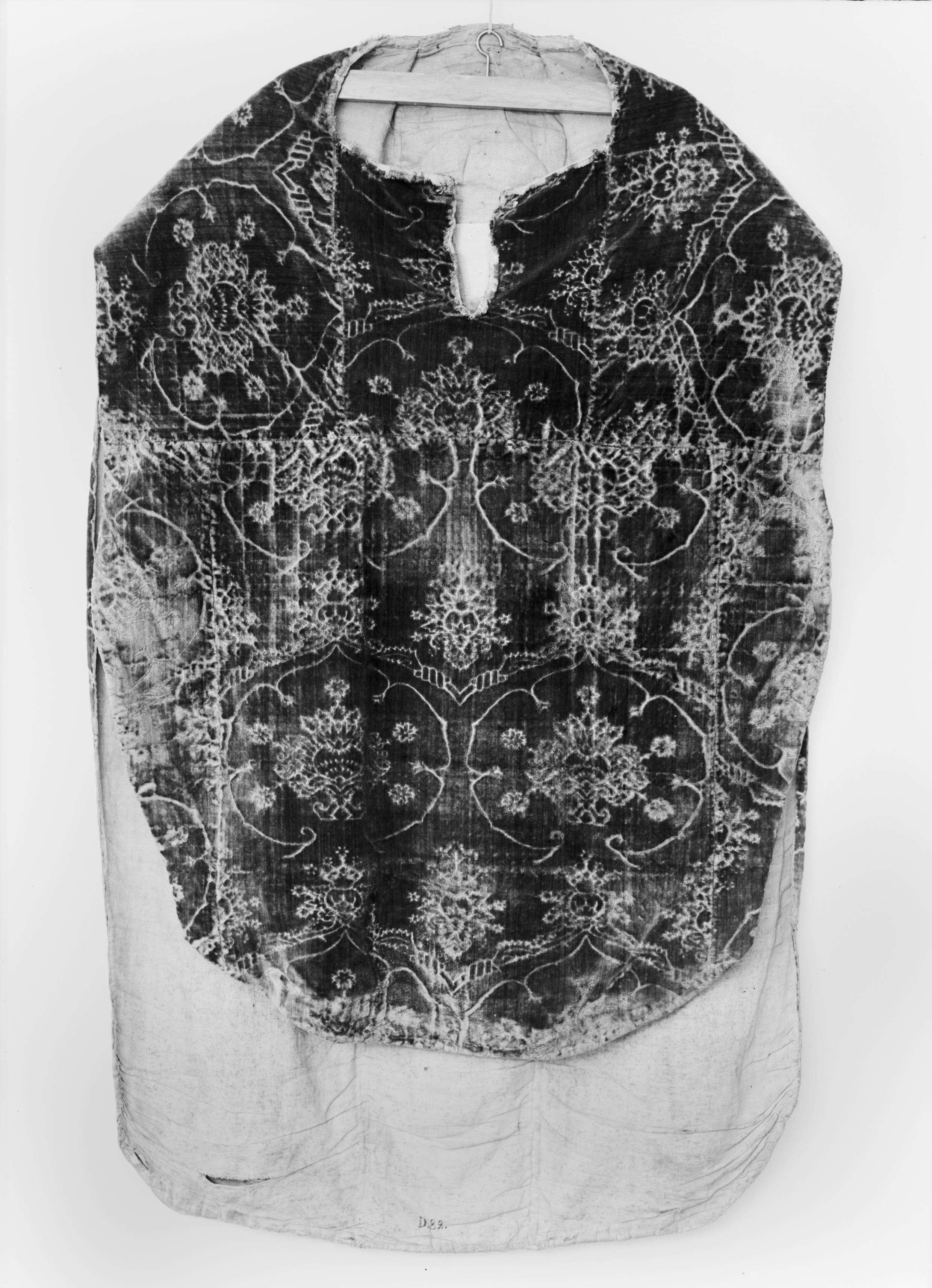 Beskrivning: Mässhake av grön sammet, skuren i granatäpplemönster. Bröststycket.
