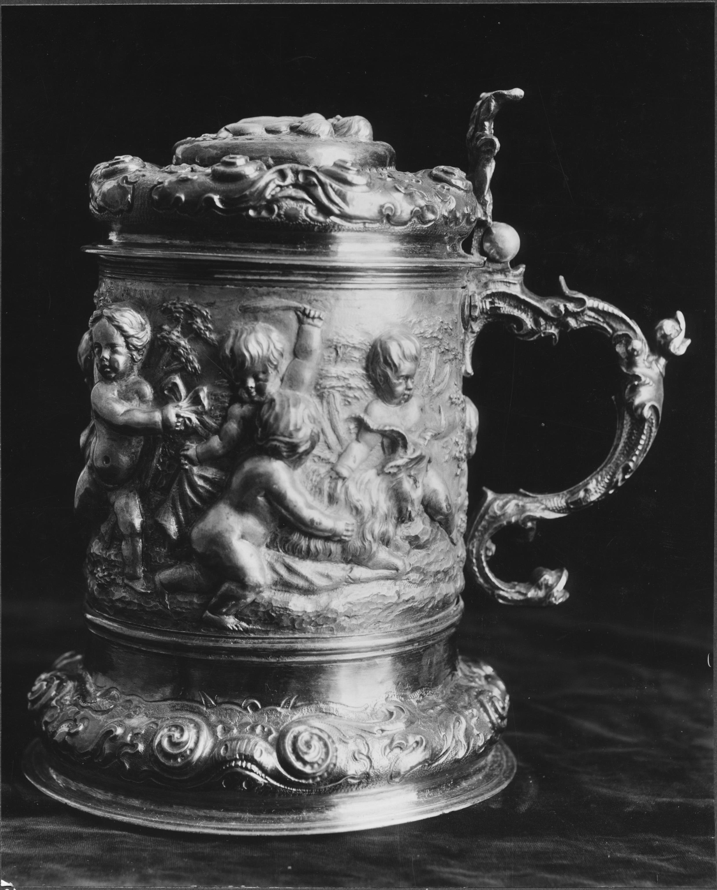Beskrivning: Kanna av silver, till större delen förgylld. Dekorerad med barnfigurer lekand ei ett landskap samt pressade och punsade ornament i broskstil. Högt drivet arbete. Omkring 1650, snabbinv.