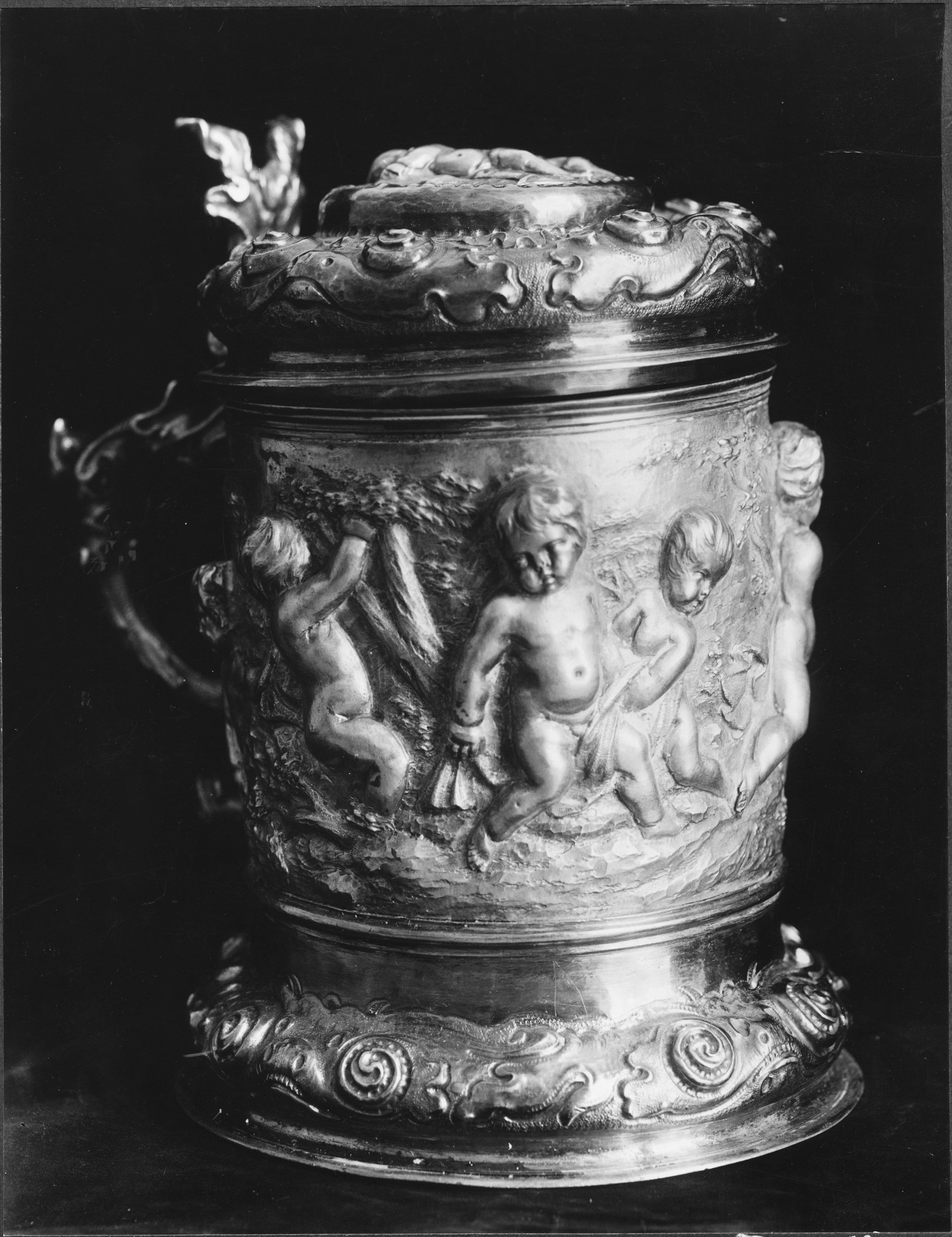 Beskrivning: Kanna av silver, till större delen förgylld. Dekorerad med barnfigurer lekande i ett landskap samt pressade och punsade ornament i broskstil. Högt drivet arbete. Omkring 1650, snabbinv.