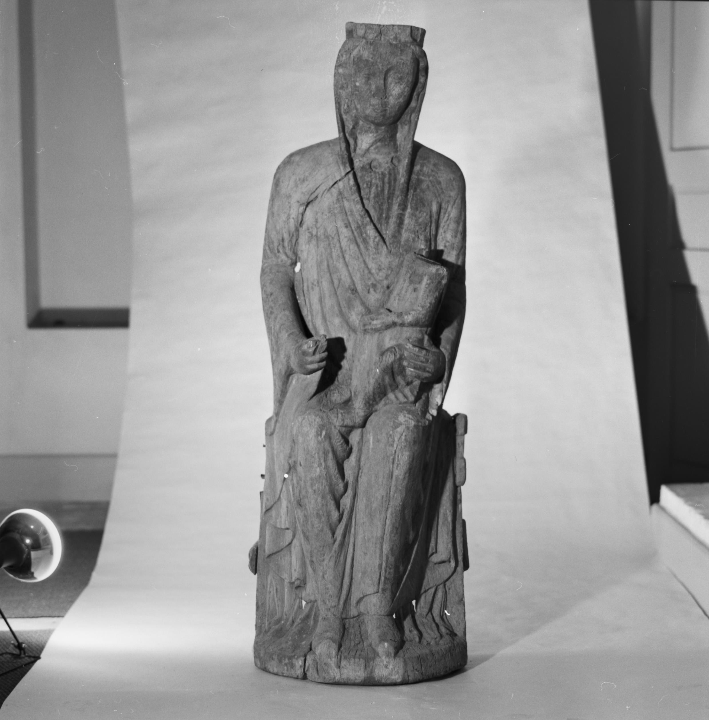 Beskrivning: Madonna. Sittande träskulptur. Vid halsen gropar, i vilka smycken suttit infattade. Manteln sluten och uppstigande kring madonnans huvud. Barnets huvud och högra arm saknas. Färgen förstörd. H. 136 cm. Omkr. 1300.