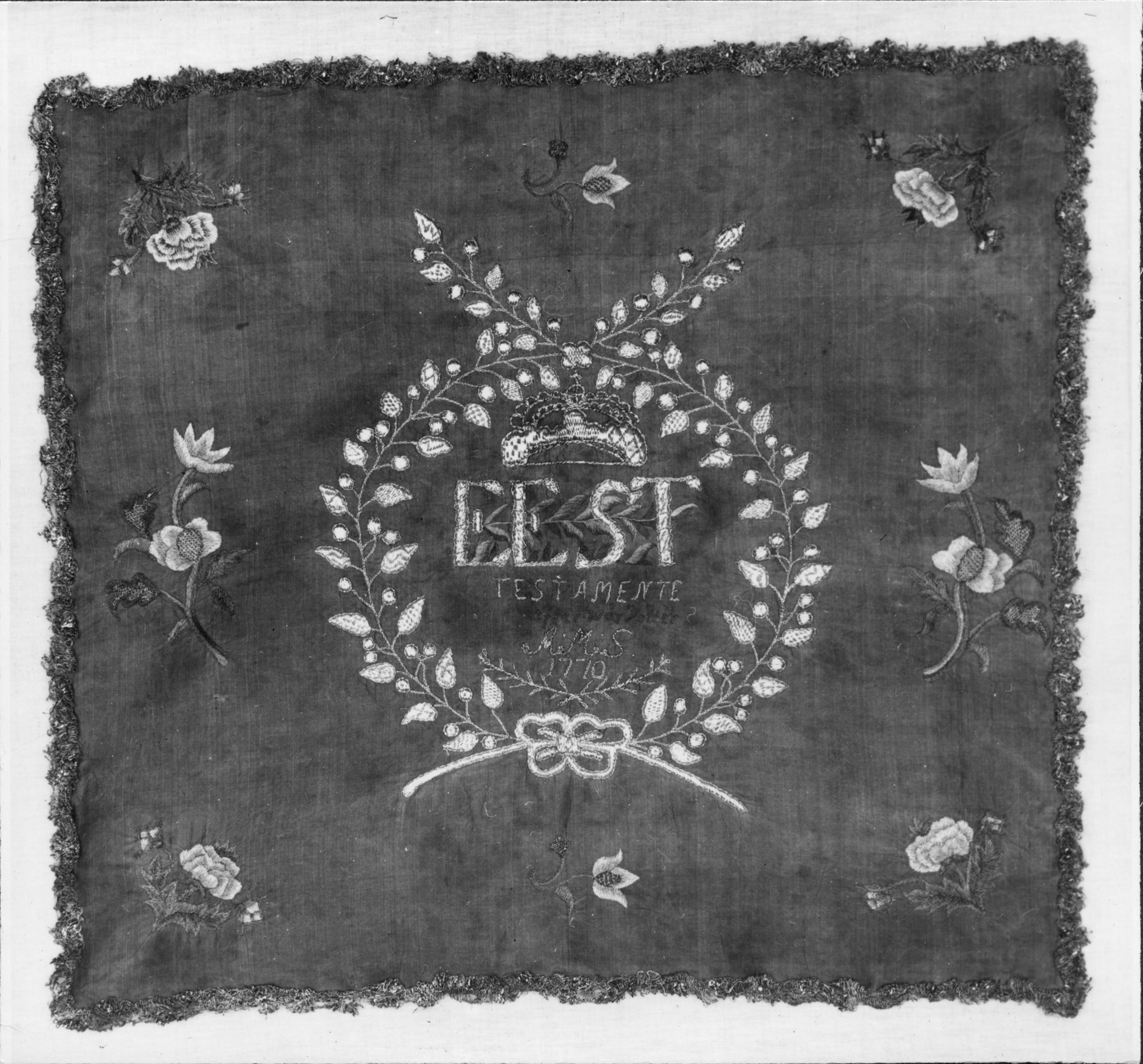 Beskrivning: Kalkkläde av blått siden med broderi. Inskrift samt krona, korslagda bladkvistar och rosenkvistar, guldspets vid kanten, snabbinv. Efter renovering.