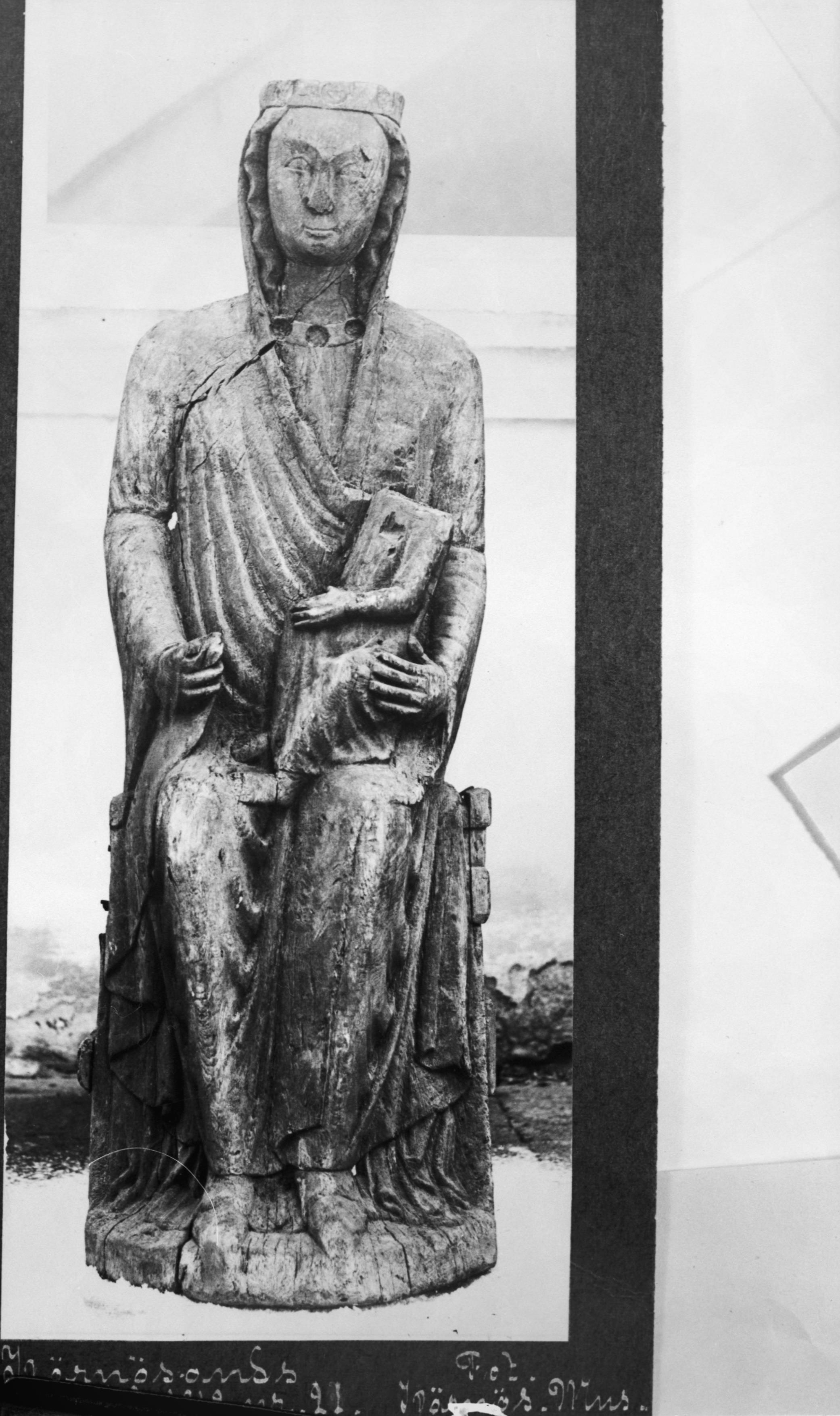 Beskrivning: Madonna. Sittande träskulptur. Vid halsen gropar, i vilka smycken suttit infattade. Manteln sluten och uppstigande kring madonnans huvud. Barnets huvud och högra arm saknas. Färgen förstörd. H. 136 cm. Omkr. 1300. Härnösandsutst. 1912 nr. 21