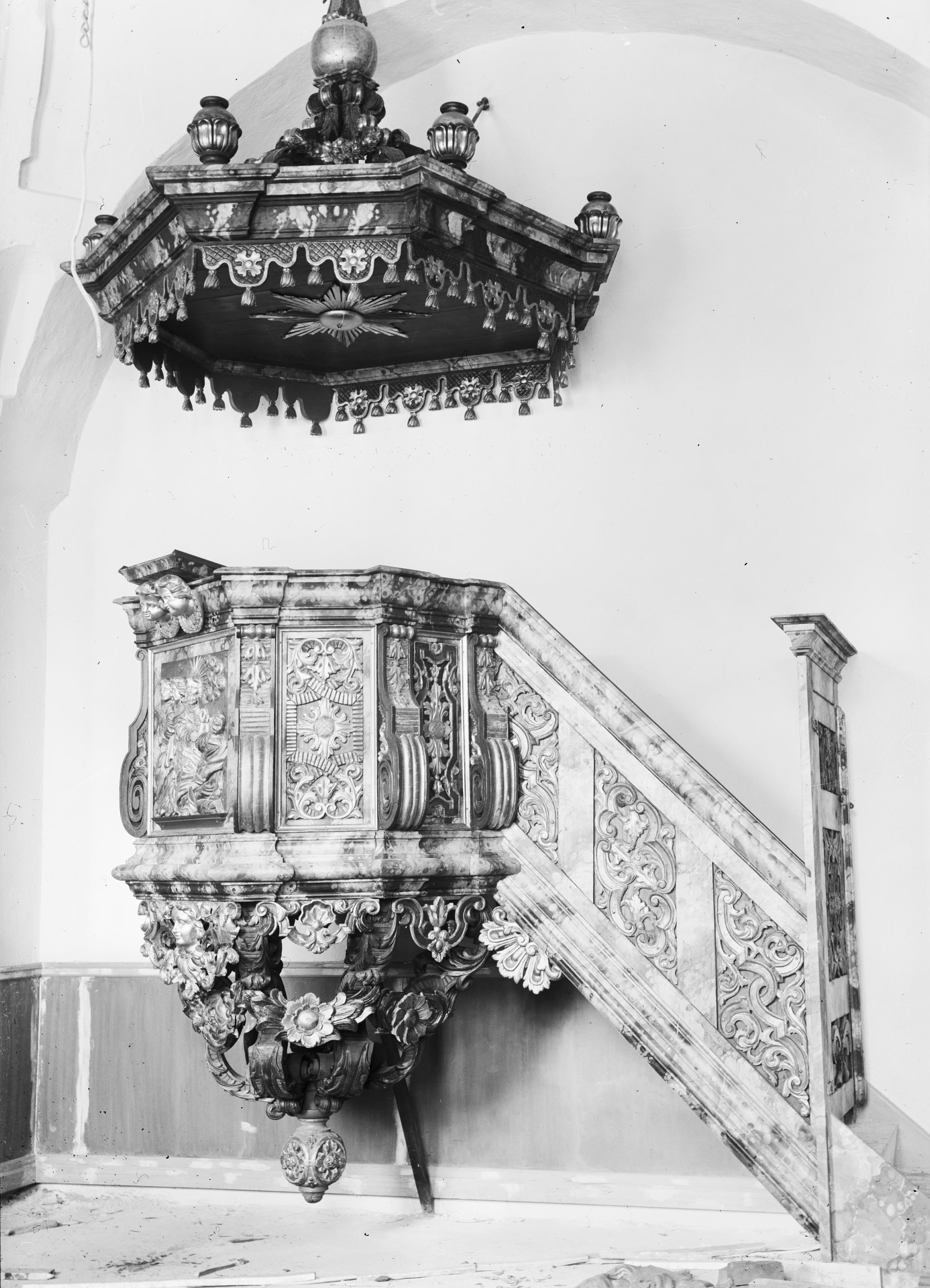 Beskrivning: Predikstol med tak, av trä. I hörnen konsoler, rött och guld. Fyllningen på speglarna i guld och blått med röd botten. Två änglahuvuden stödjer bokpallen. Trappa och dörr ornerade med samma slagas fyllningar som predikstolsidan. Marmorerad i blått och vitt samt rött och vitt. Utförd av Magnus Gran 1739, snabbinv. Efter restaurering.