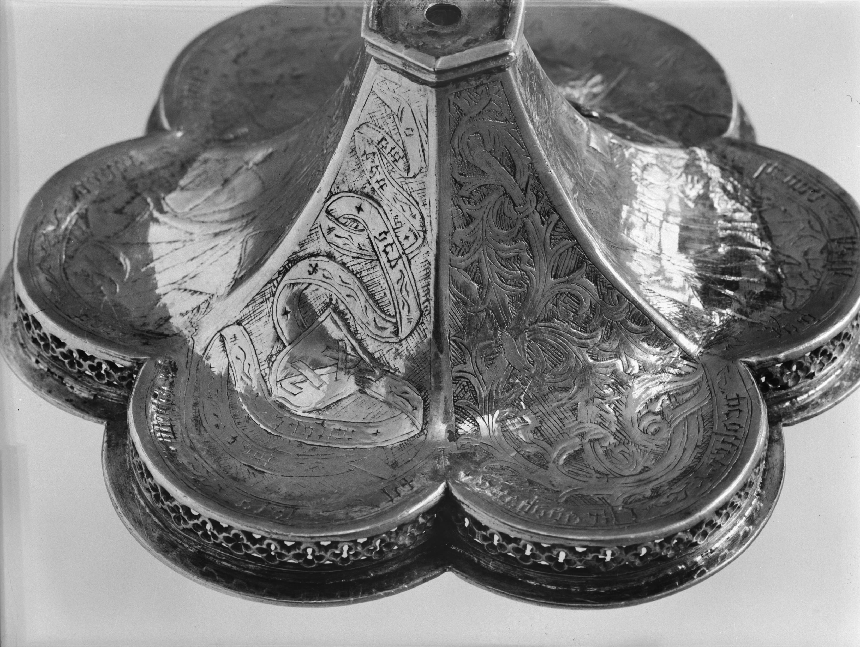 Beskrivning: Kalk av silver, förgylld. Detalj av foten, 6-passformig med ornering. Graveringar: blad, bomärke (?) i sköld.