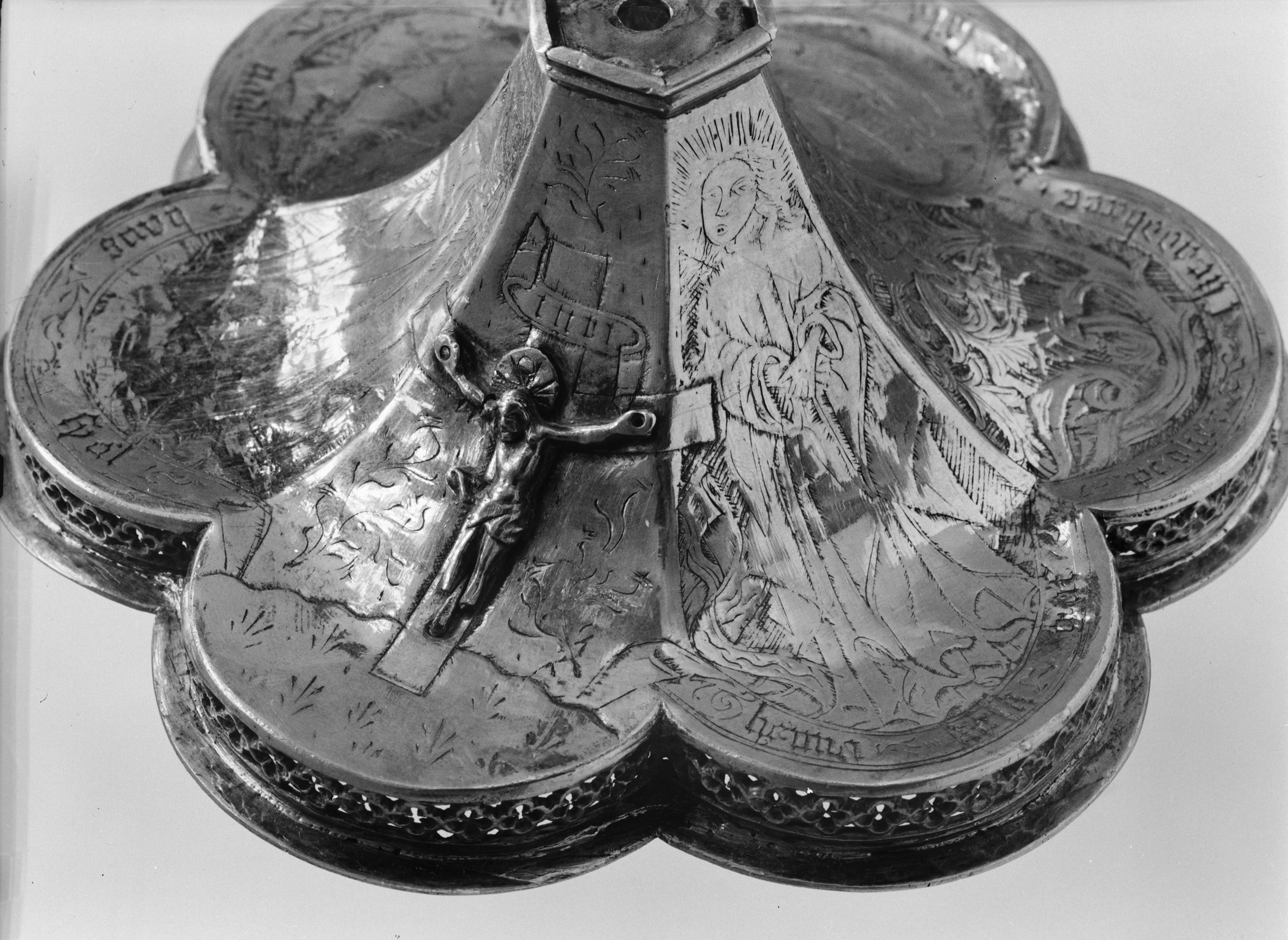 Beskrivning: Kalk av silver, förgylld. Detalj av foten, 6-passformig med ornering. Graveringar: kors med fastnitad Kristusbild samt bild av Maria.