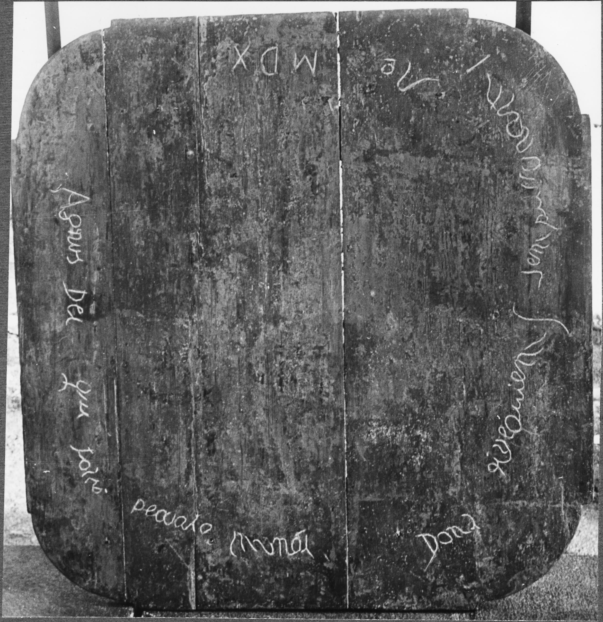 Beskrivning: Bord/pall? av trä. Ovansida.