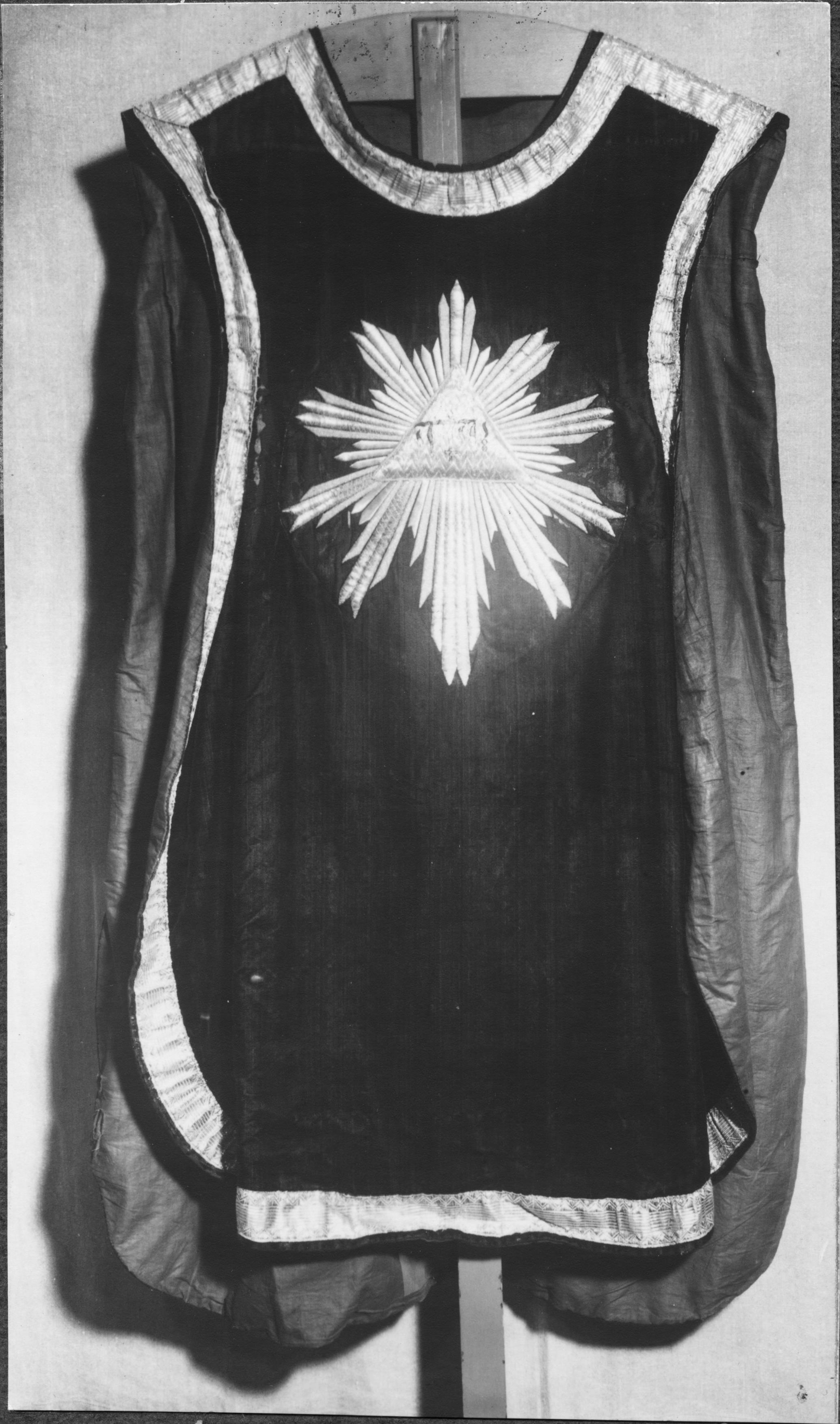Beskrivning: Mässhake. Ornering med band och broderi i silverfärg. På bröststycket Jehova i sol. Före konservering 1937.