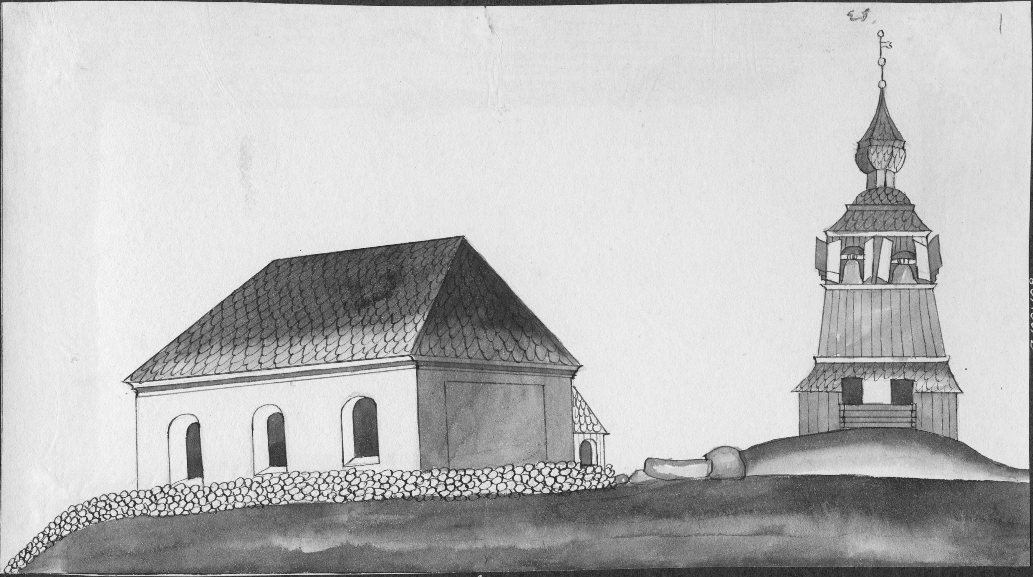Beskrivning: Teckning av kyrkan och klockstapeln. Ur Ohlson: "Ångermanlands kyrkor ritade 1828". Ekdahls samling.