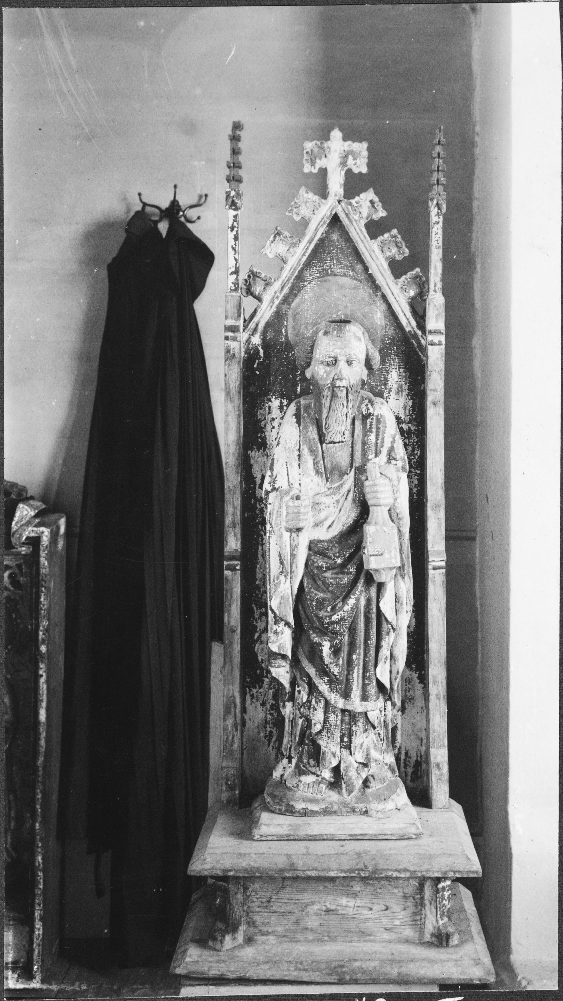 Beskrivning: Apostel, träskulptur. Ryggbrädan har gotisk ornamentik. 1400-talet, snabbinv.