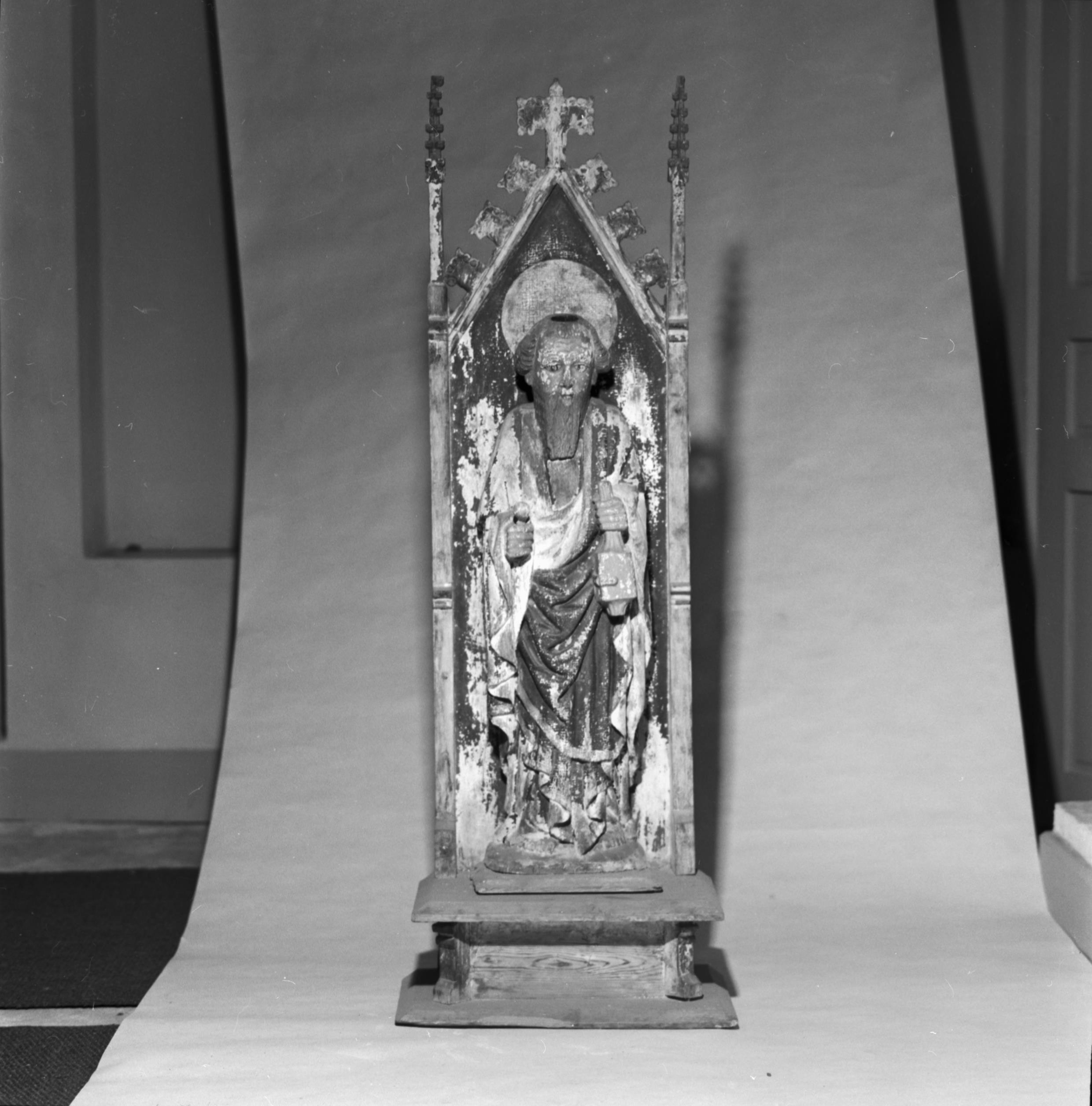 Beskrivning: Apostel, träskulptur. Ryggbrädan har gotisk ornamentik. 1400-talet, snabbinv.