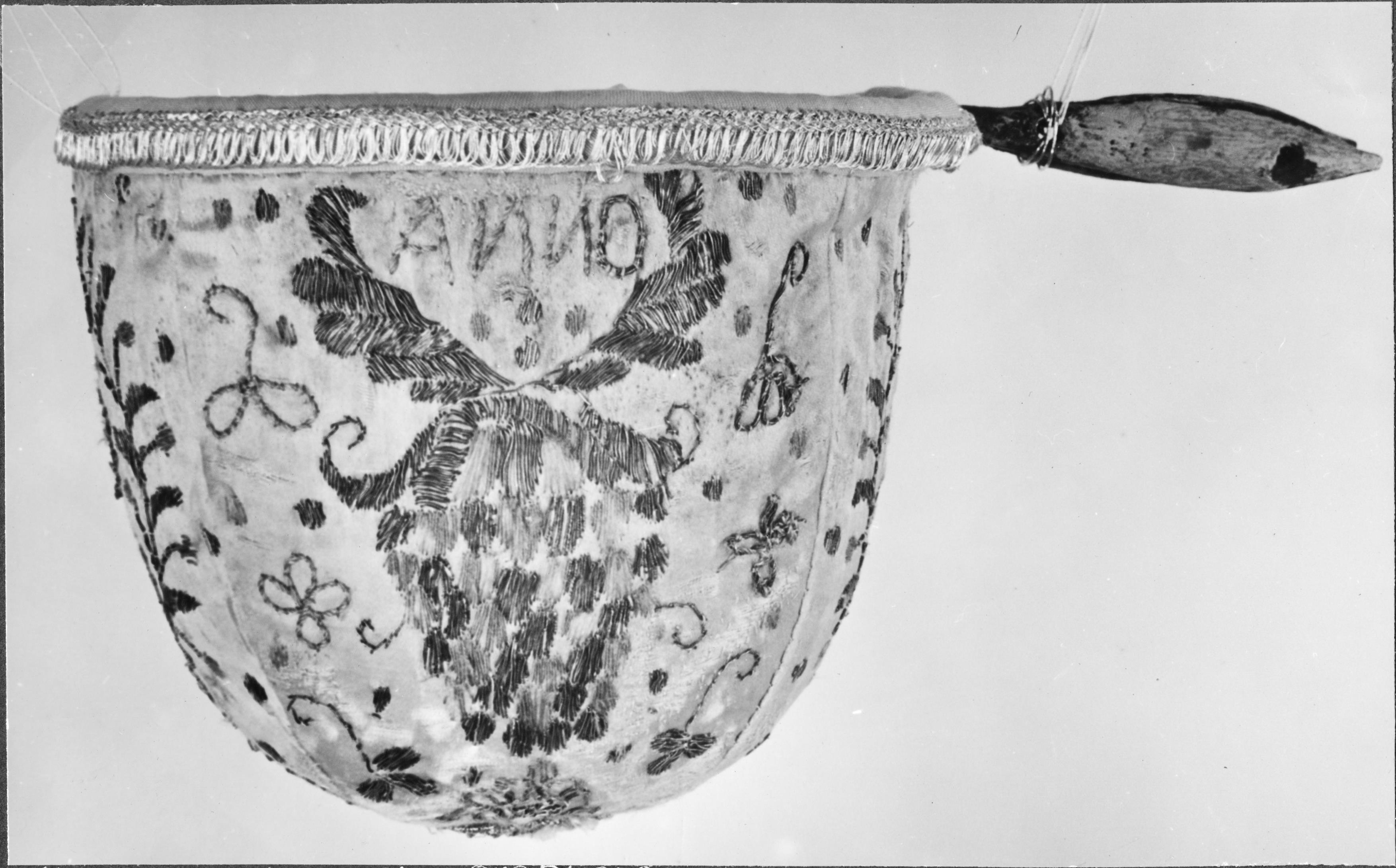 Beskrivning: Håv, av vitt siden. Flerfärgat silkebroderi. Inskrift: IN SB Anno 1721, snabbinv. Efter renovering.