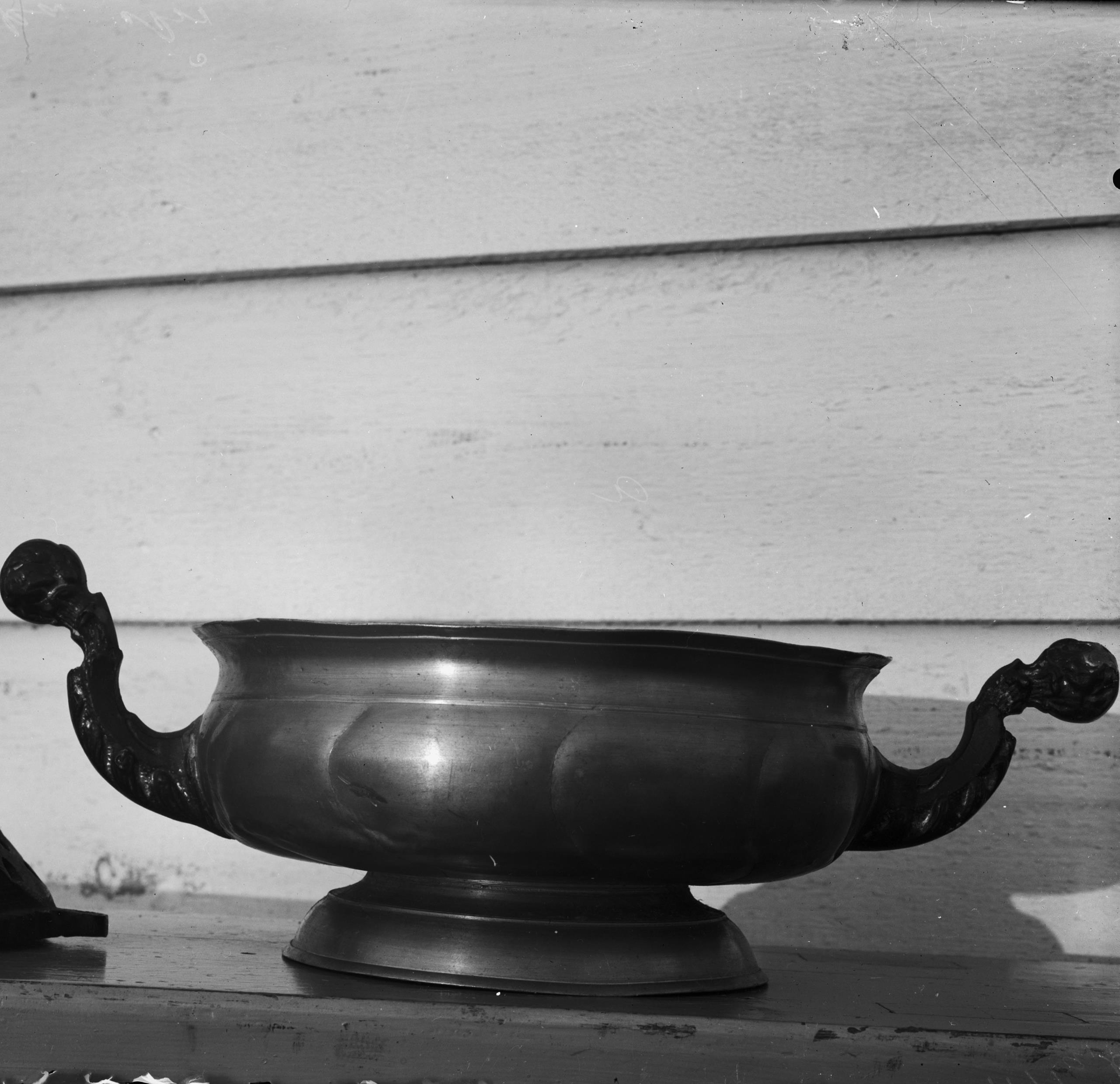 Beskrivning: Dopskål, av tenn, rund. Två grepp i form av fot med klor som griper omkring klot, snabbinv.