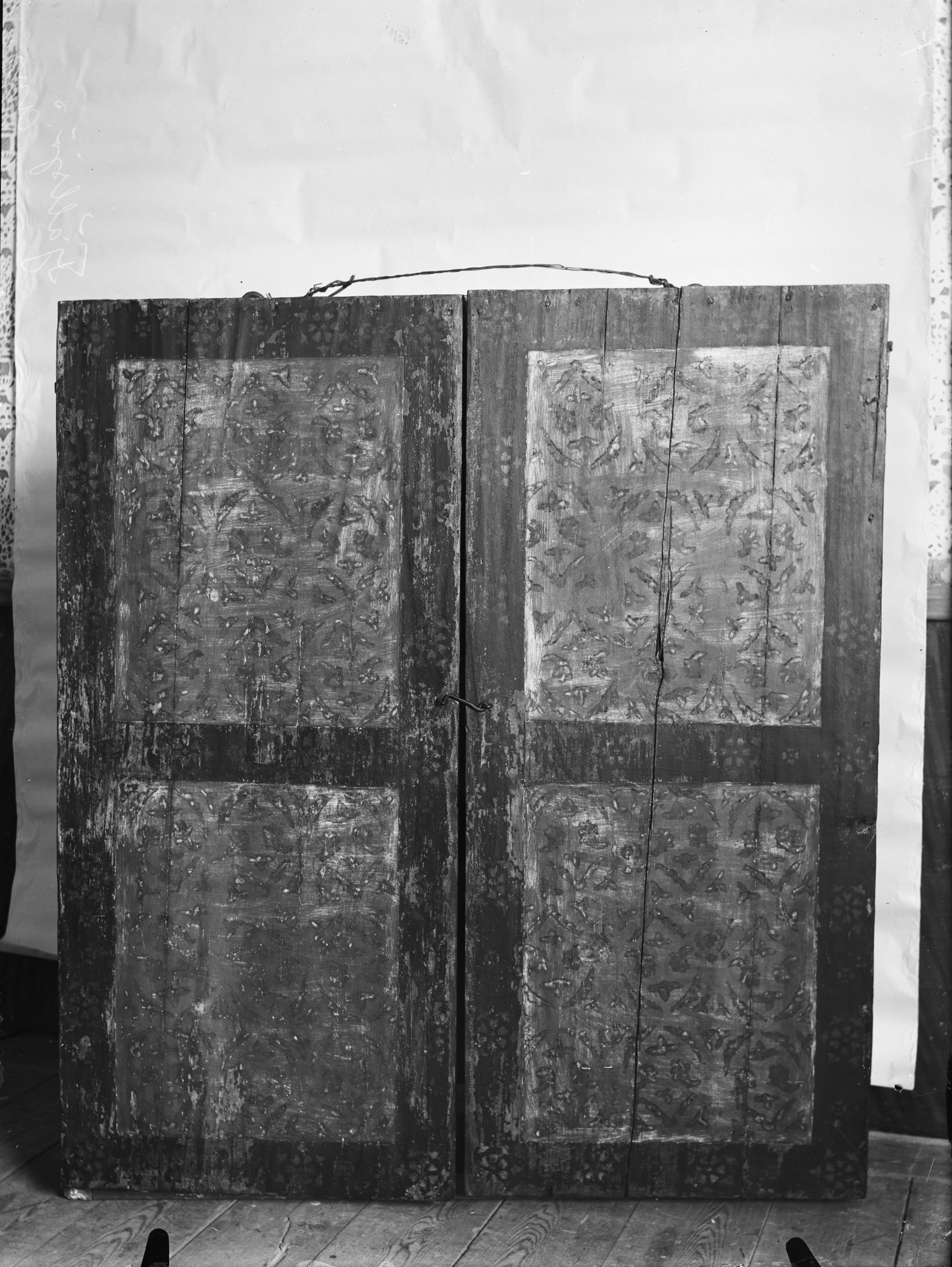 Beskrivning: Altarskåp, träskulptur. Dörrarnas yttersidor. 1500-talets början. Efter konservering 1925.