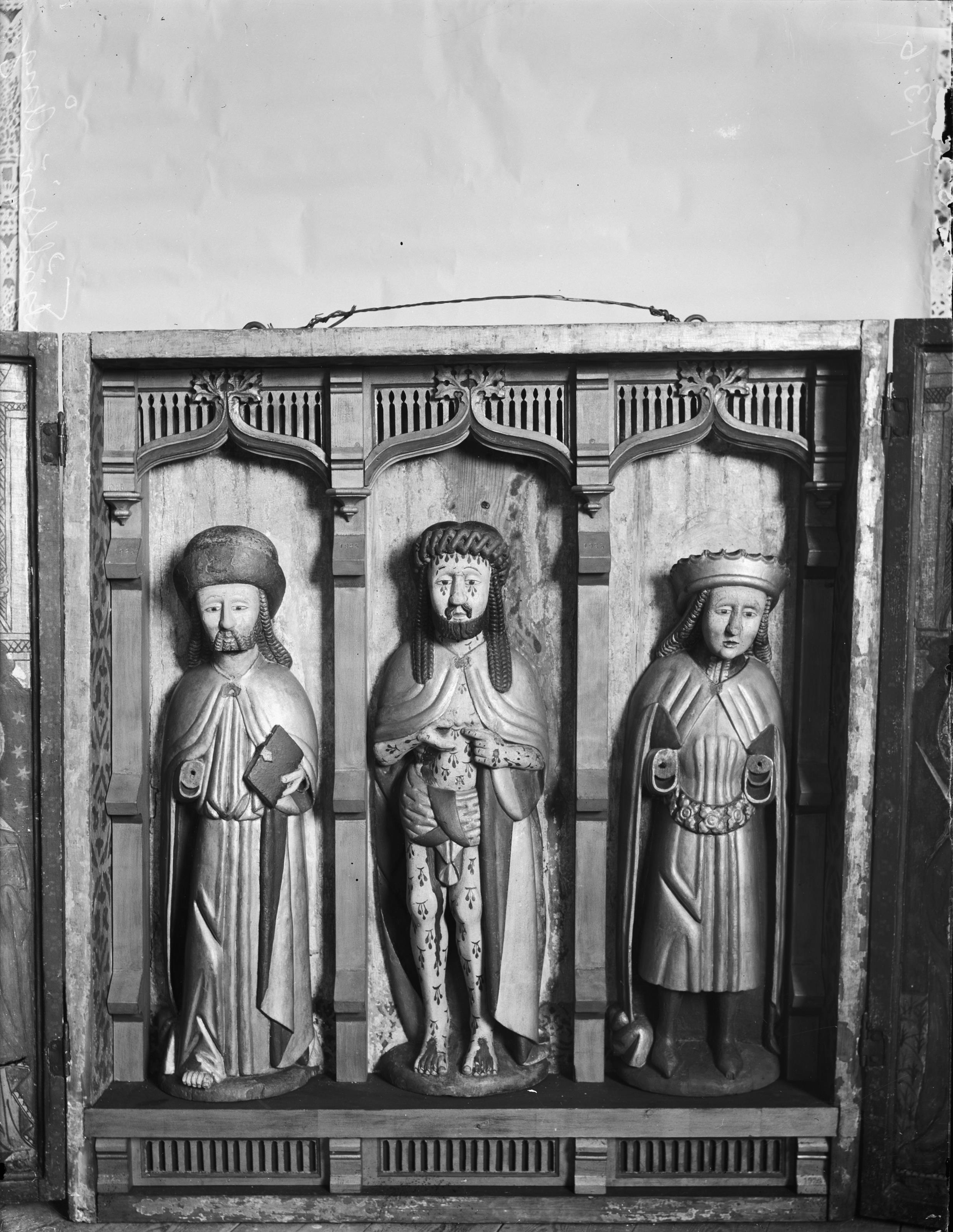 Beskrivning: Altarskåp, träskulptur. Tre figurer: Kristus som smärtornas man visande sina sår, St Olov och jacob dä. 1500-talets början, snabbinv. Efter konservering 1925.
