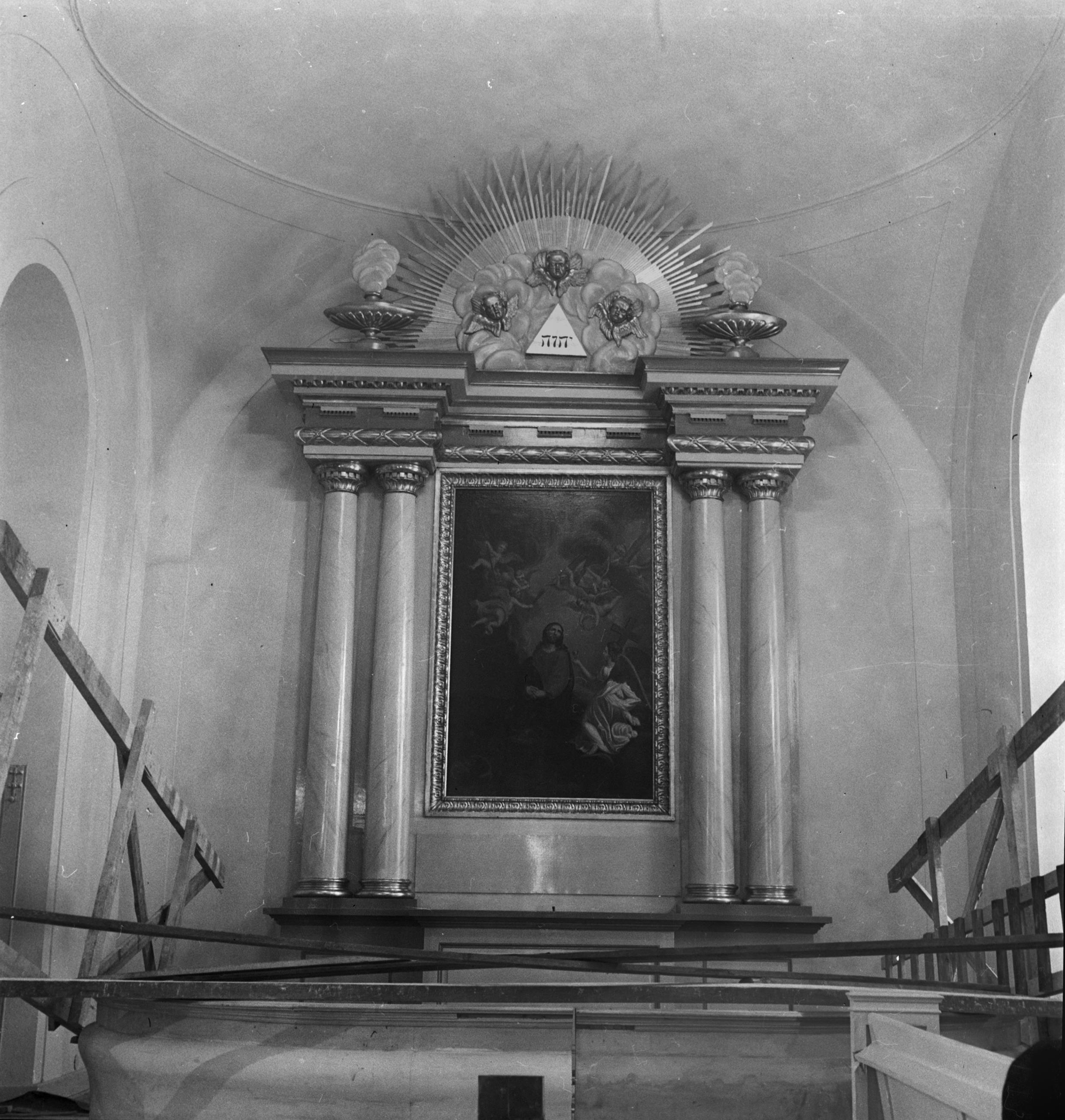 Beskrivning: Altaruppsats av trä. Två rundade pilastrar uppbär ett överstycke. 1700-talet, snabbinv.