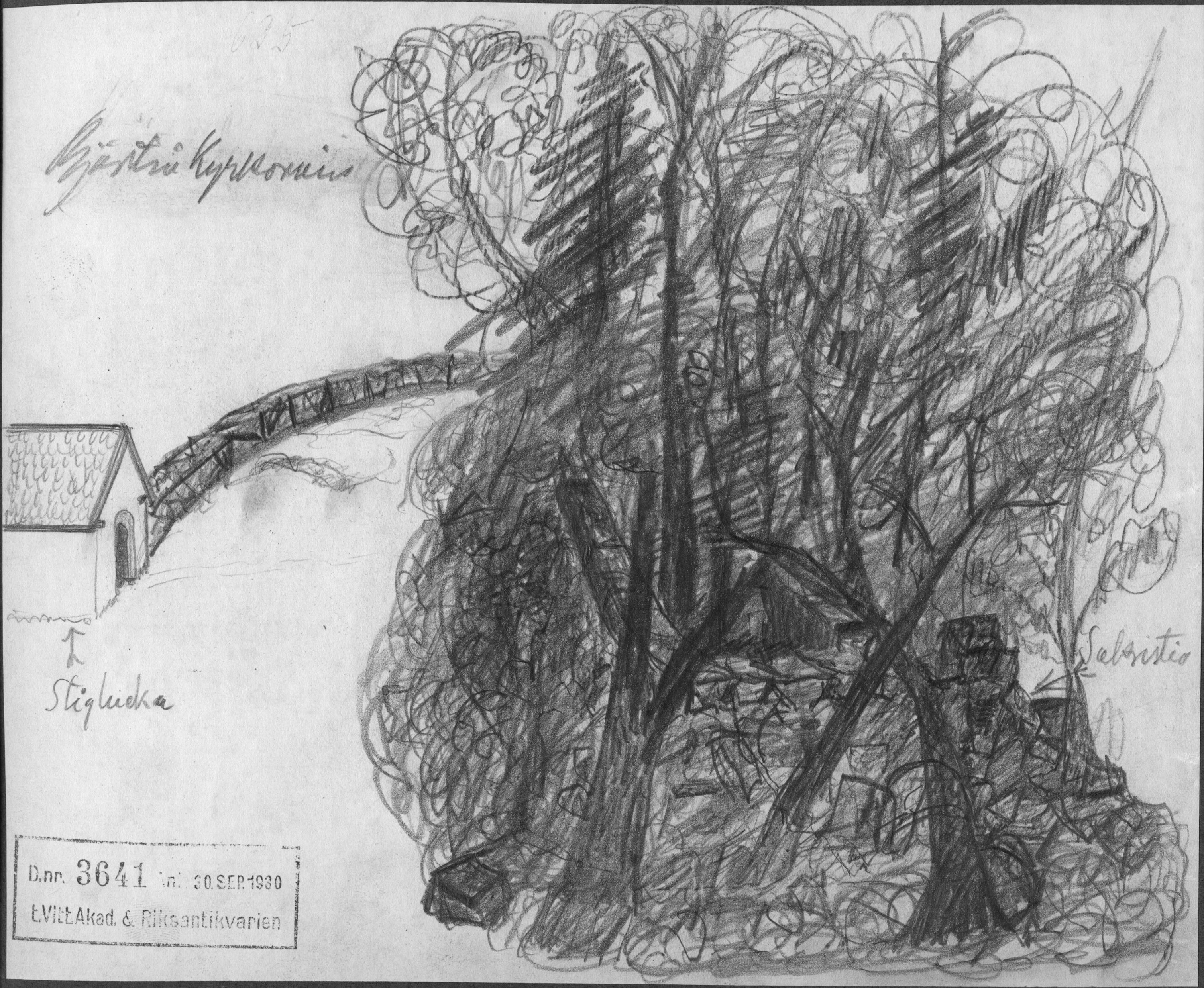 Beskrivning: Teckning över kyrkoruinen samt stigluckan, av O. Häggström.